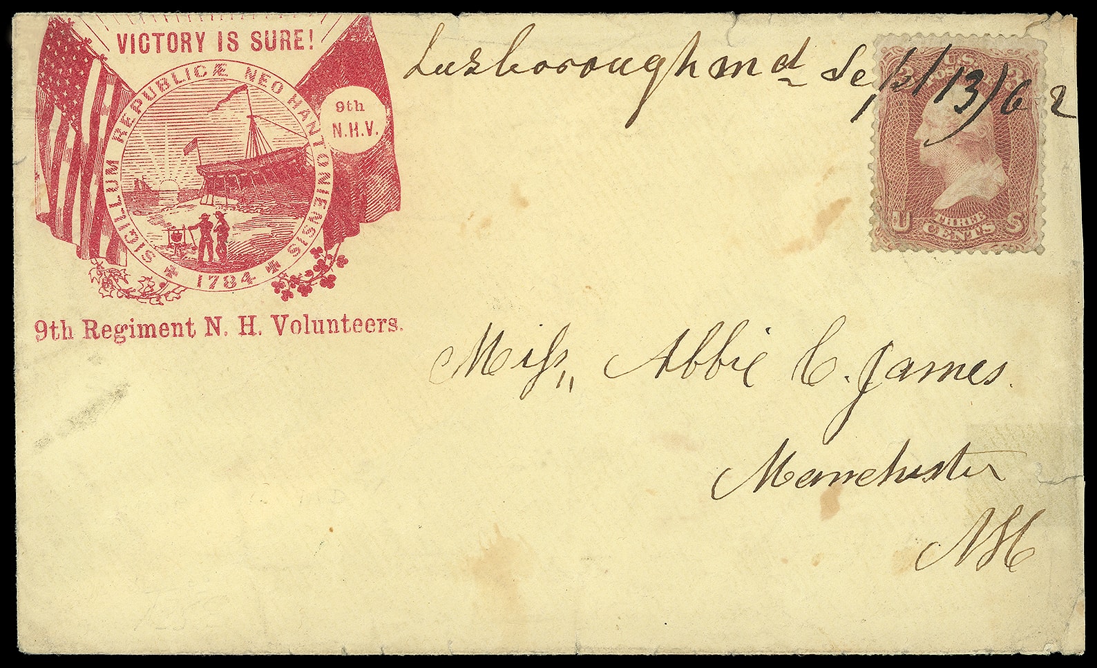 Volunteers. Red regimental "Victory is Sure!" patriotic design showing state seal flanked by American and Regimental flags on amber cover bearing 3¢ rose (65) tied by ms. "Leesborough Md. Sept 13/62" postmark to Manchester N.H.;