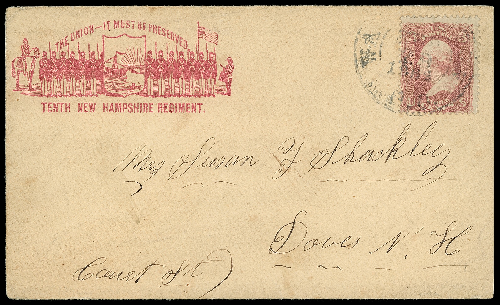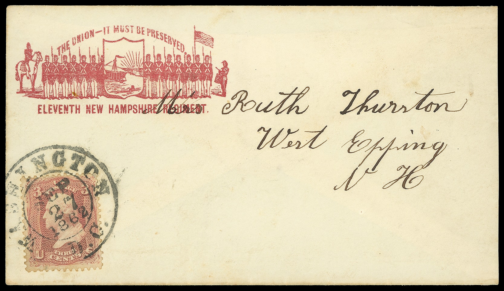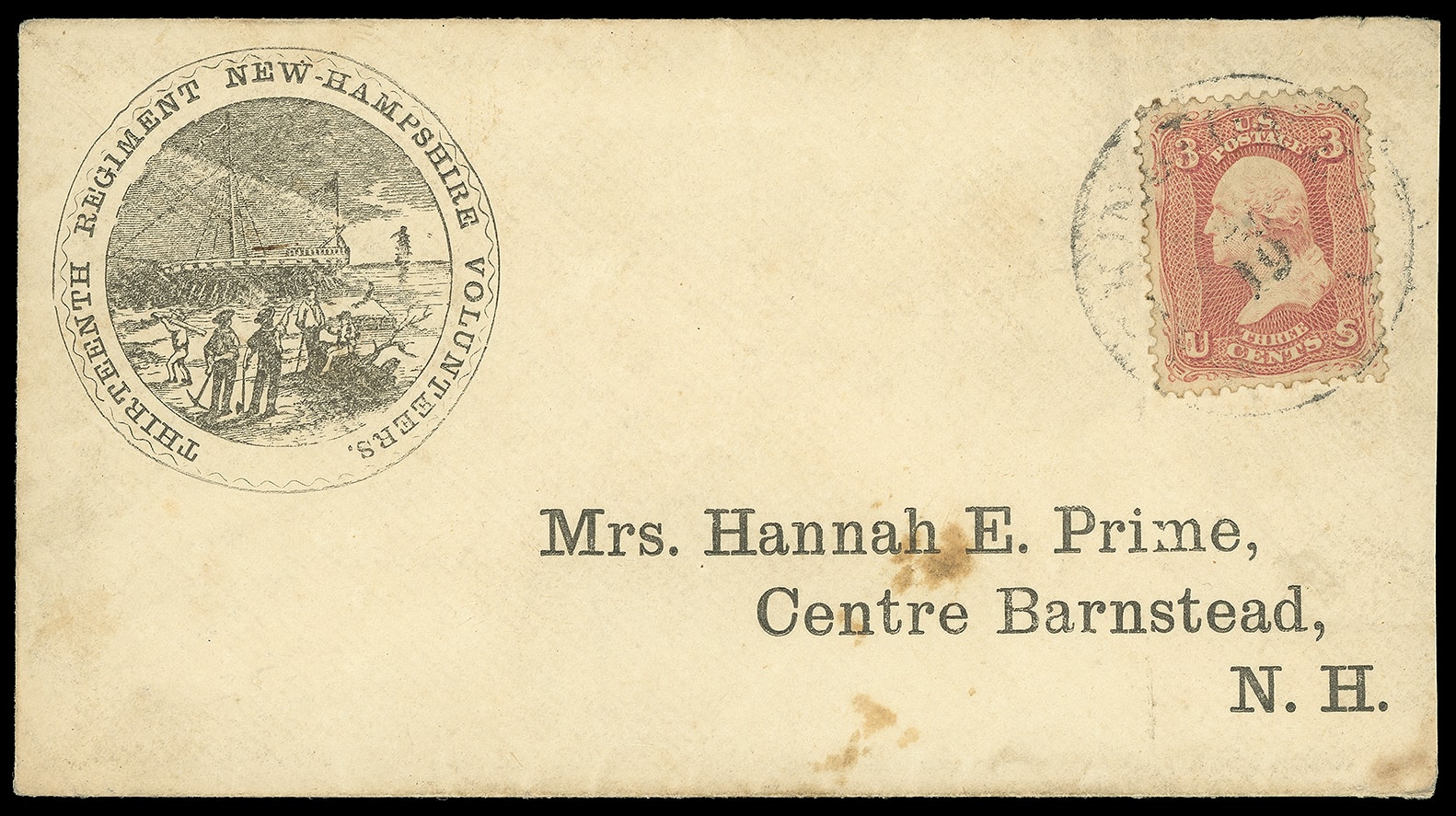 New-Hampshire Volunteers. Regimental patriotic design showing state seal on cover bearing 3¢ rose (65) tied by "Washington City D.C." cds with preprinted address to Centre Barnstead N.H.; reduced slightly at right, couple tone spots,