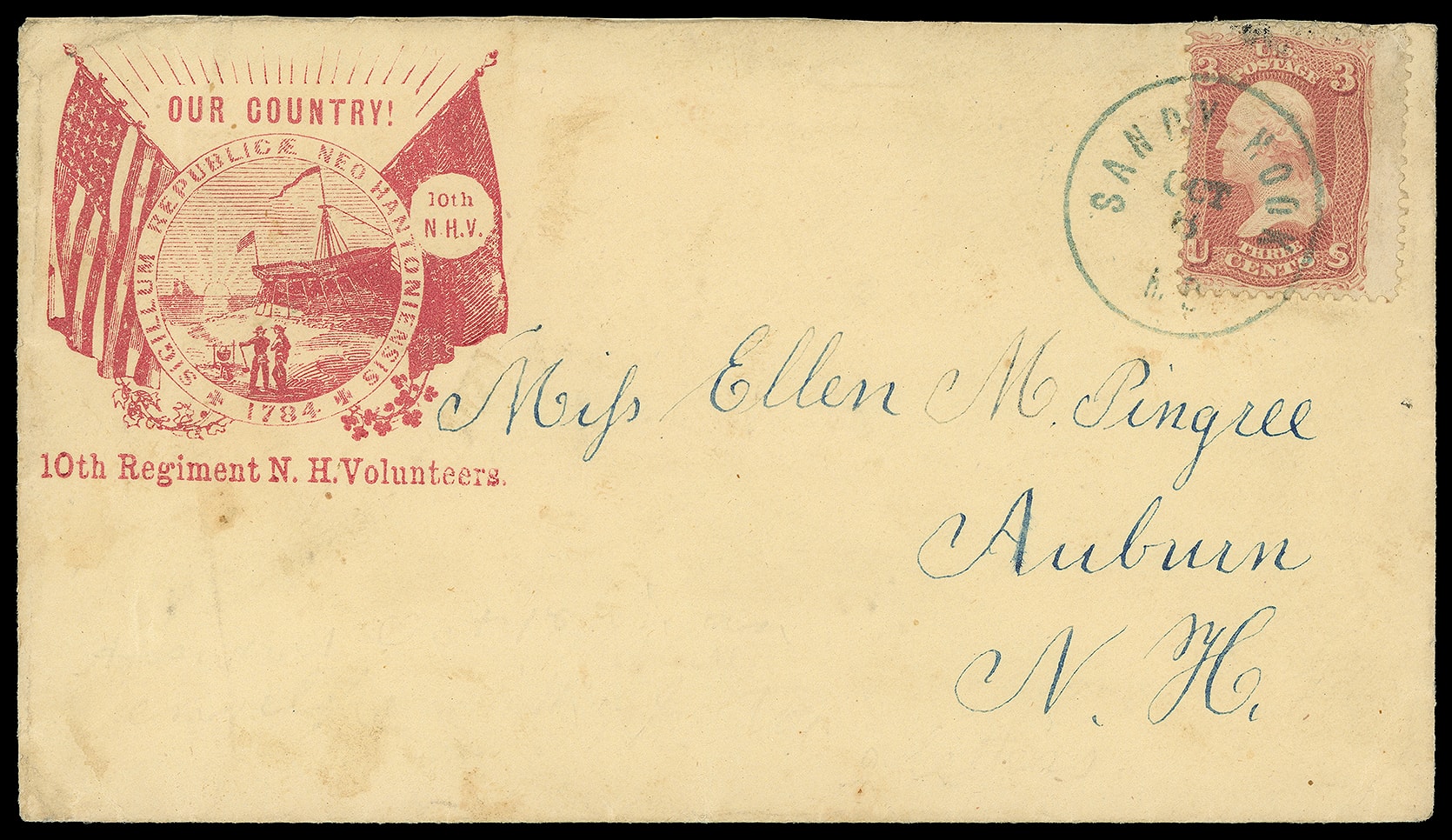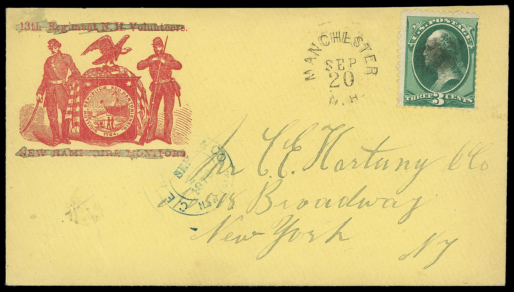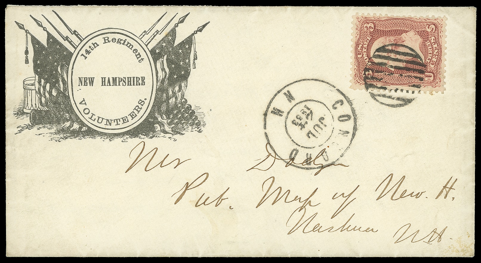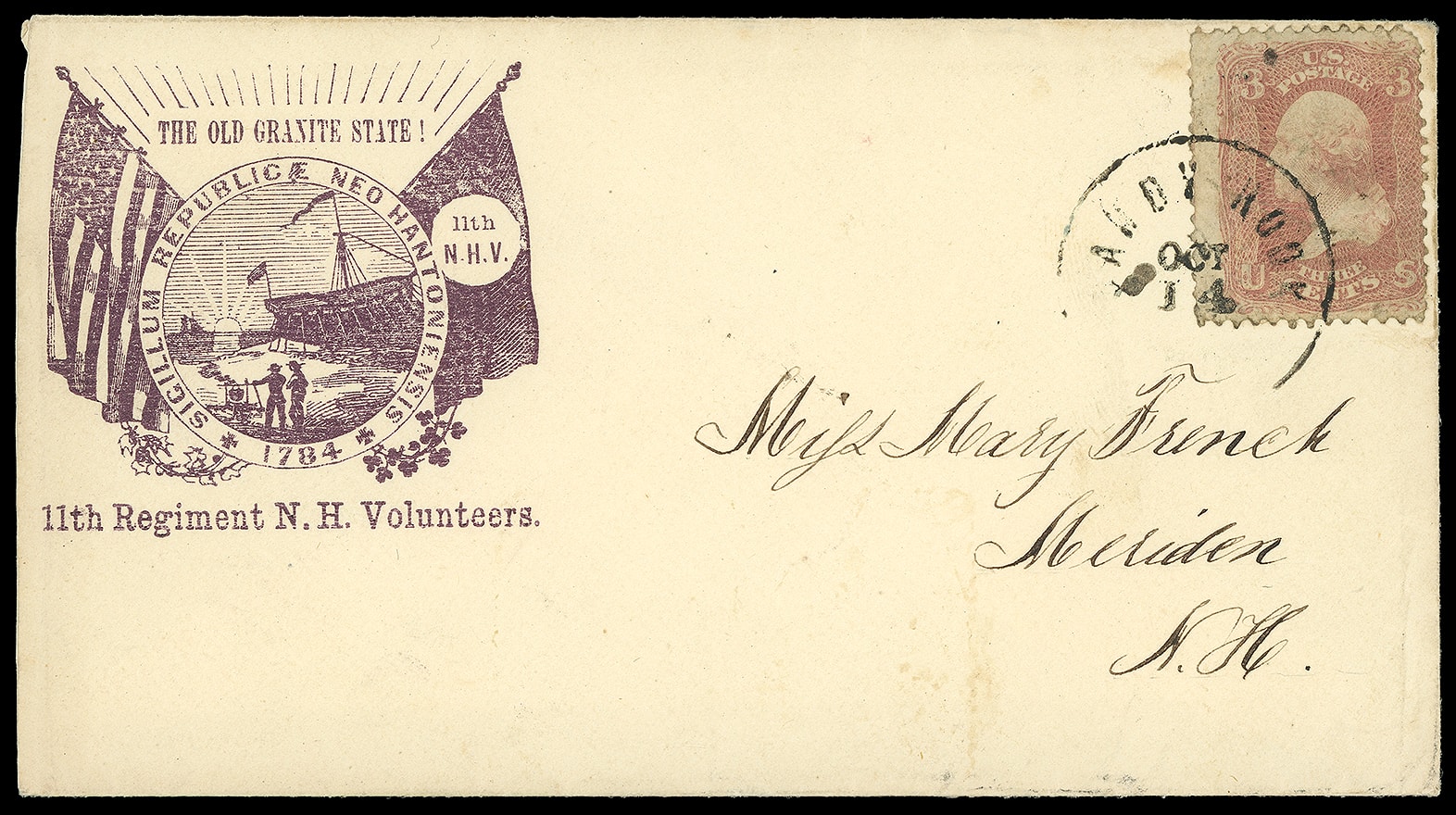New-Hampshire Volunteers. Regimental patriotic design showing state seal on cover bearing 3¢ rose (65) tied by "Washington City D.C." cds with preprinted address to Centre Barnstead N.H.; reduced slightly at right, couple tone spots,