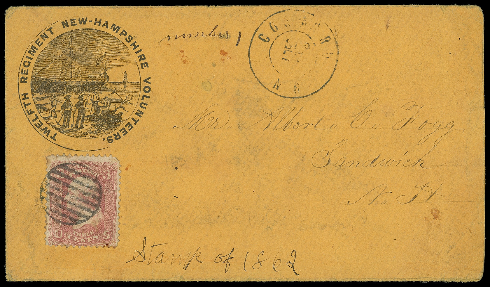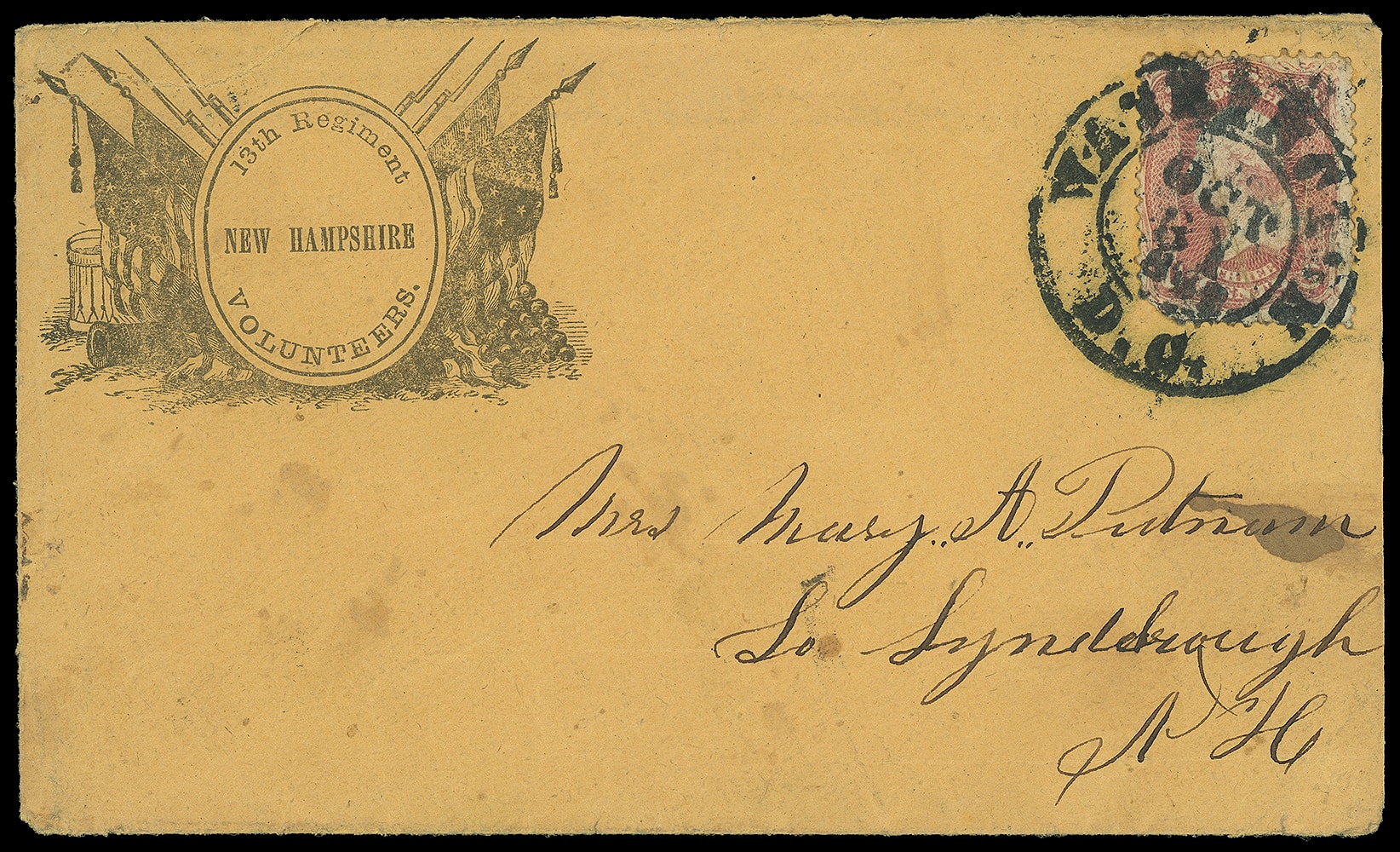 Hampshire Volunteers. Regimental draped flag patriotic design on orange cover bearing 3¢ rose (65), faults, tied by "Washington D.C. Oct 31, 1862" cds to South Lyndborough N.H.; opening tear at top, minor stain in address, F.-V.F.,