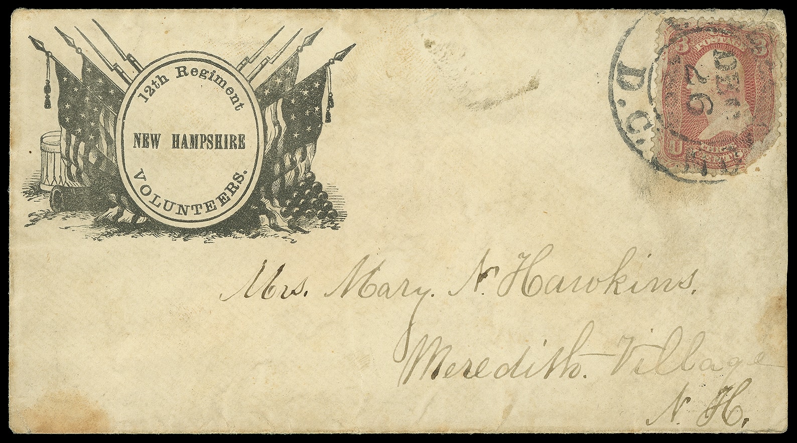 Hampshire Volunteers. Regimental draped flag patriotic cover bearing 3¢ rose (65), faulty, tied by "Washington D.C. Dec 26, 1862" cds to Meredith Village N.H.; light soiling, couple tone spots, Fine. Walcott No. 1367 var.;