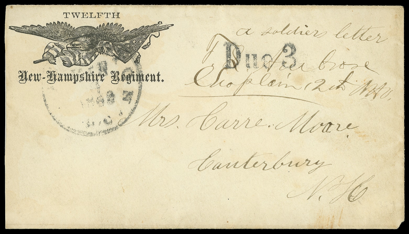 New-Hampshire Regiment. Regimental Eagle and Flag patriotic on cover endorsed "a soldiers letter" and signed by "F. Ambrose, Chaplain 12th N.H.V.", entered mails with "Washington D.C." and "Due 3" rating handstamp to Canterbury N.H.; reduced