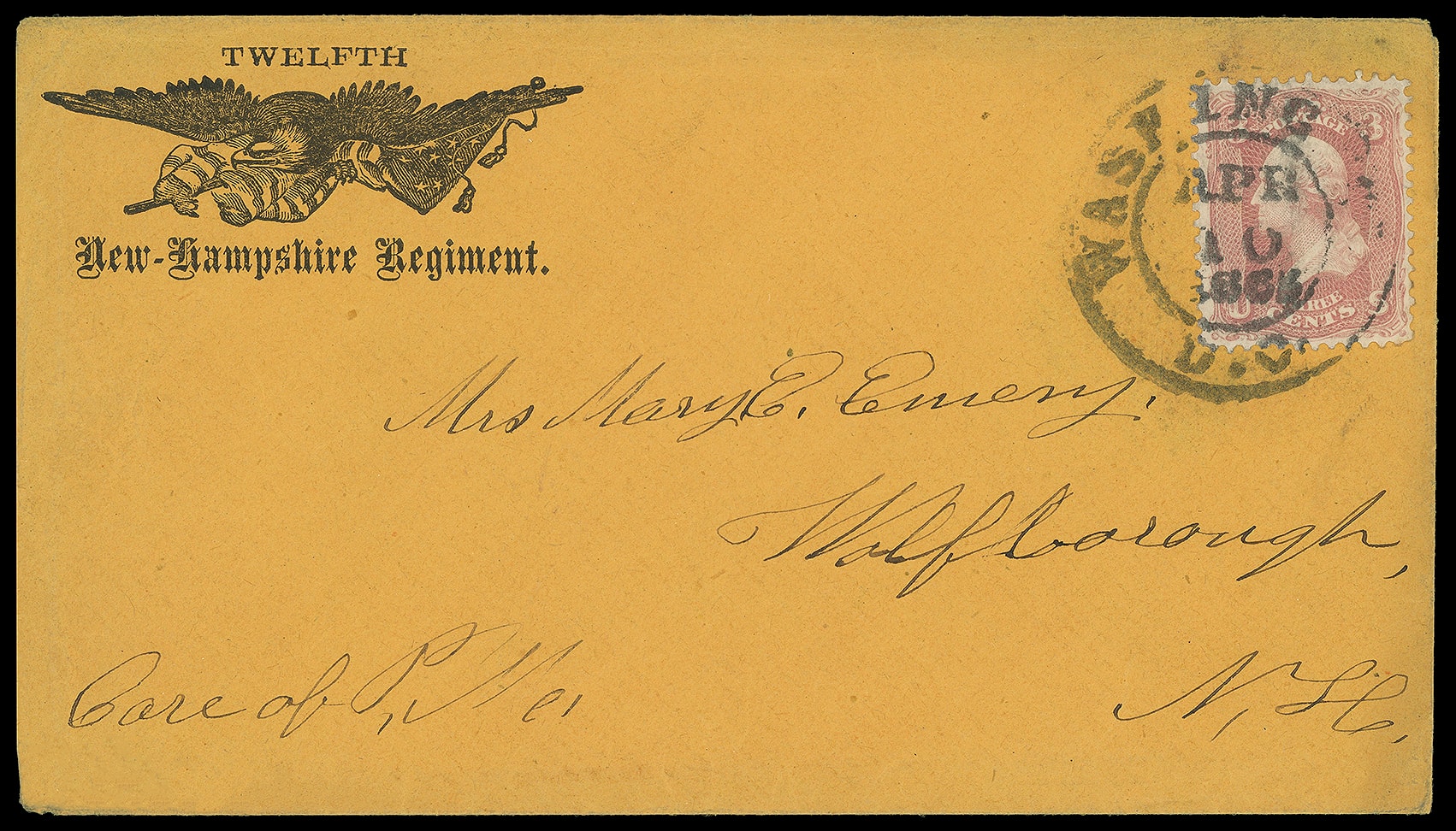 New-Hampshire Regiment. Regimental Eagle and Flag patriotic on orange cover bearing 3¢ rose (65) tied by "Washington D.C. Apr 10, 186" cds to Wolfborough N.H.; barely reduced at left, Very Fine, ex-J.R. Hill Jr. Walcott No.
