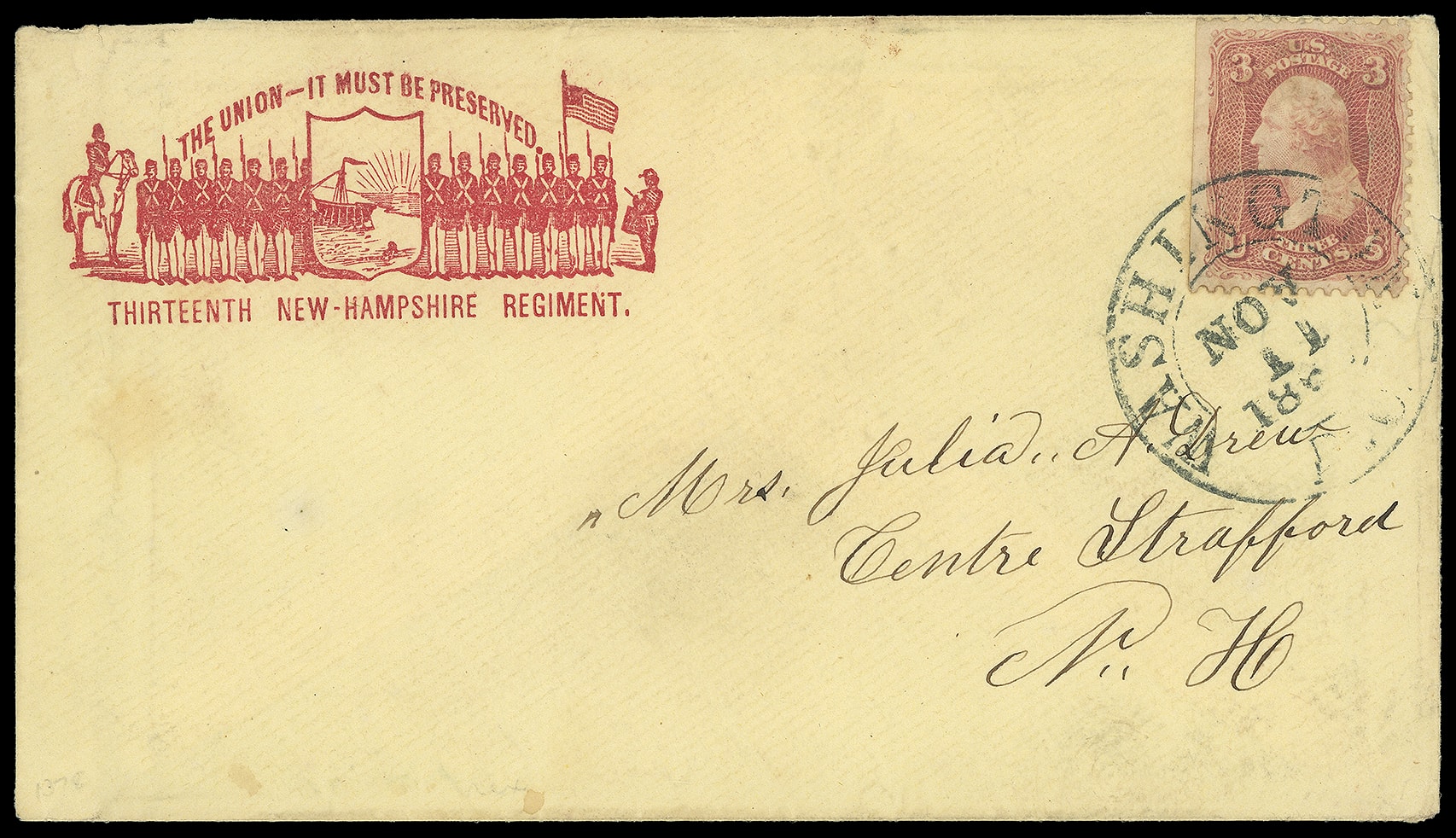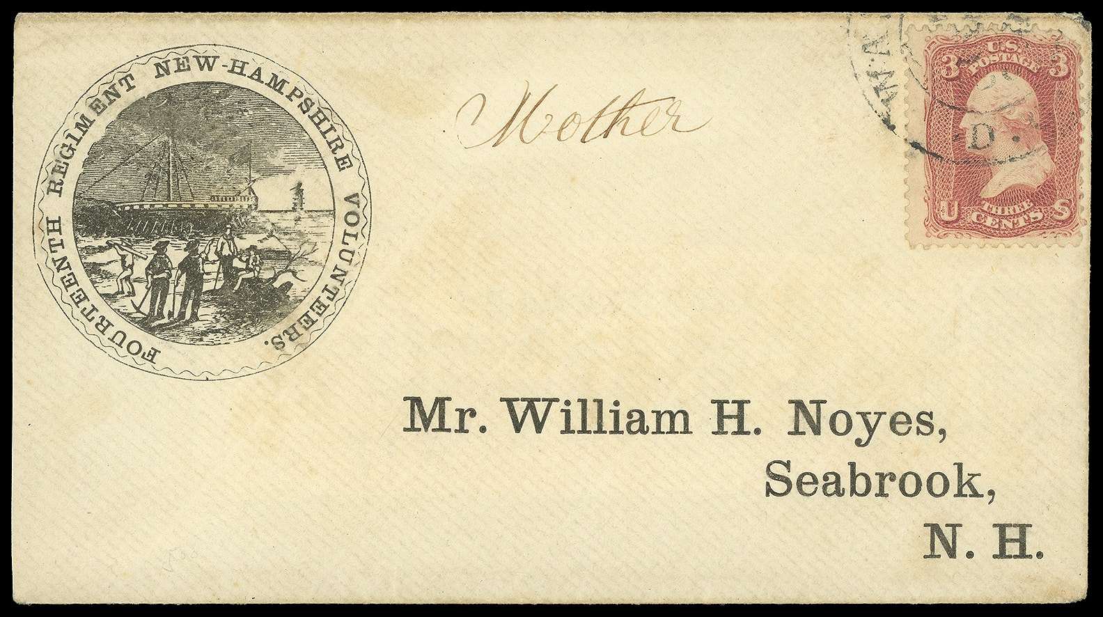 New-Hampshire Volunteers. Regimental patriotic design showing state seal on cover bearing 3¢ rose (65), rounded corner, tied by partial "Washington City D.C." cds with preprinted address to Seabrook N.H., docketed "Mother"; reduced slightly
