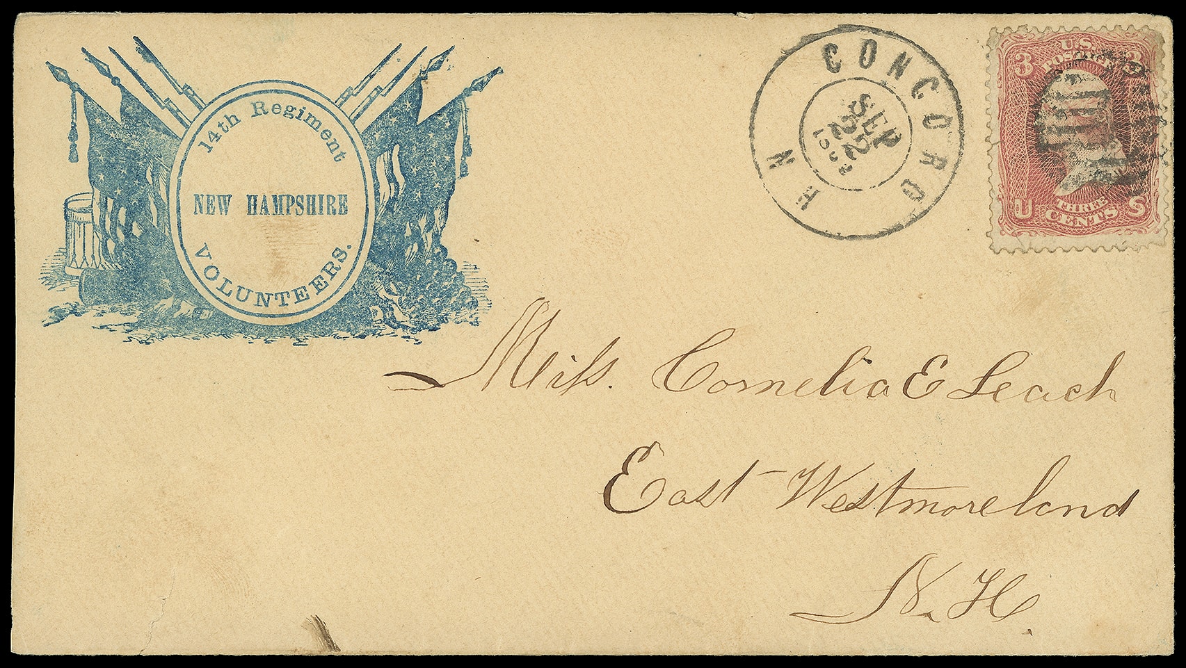 Hampshire Volunteers. Blue regimental draped flag patriotic design on light buff cover bearing 3¢ rose (65), small flaws, tied by circular grid cancel, matching "Concord N.H. Sep 22, 1862" cds to East Westmoreland N.H.; small edge tear,