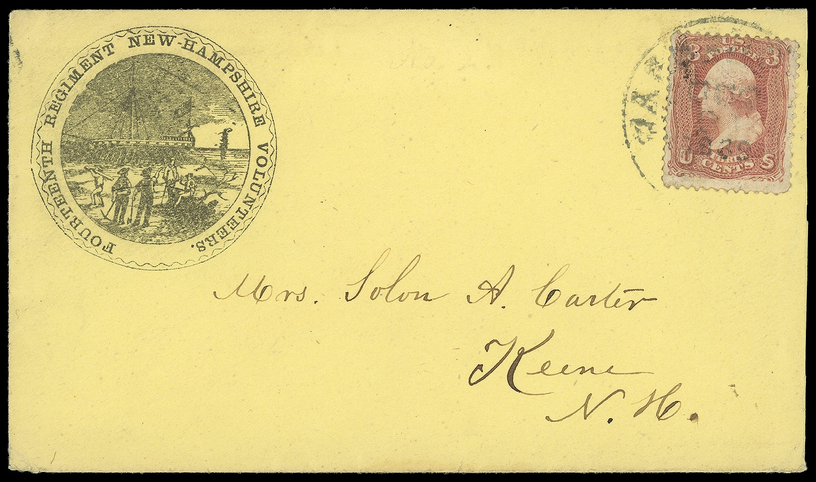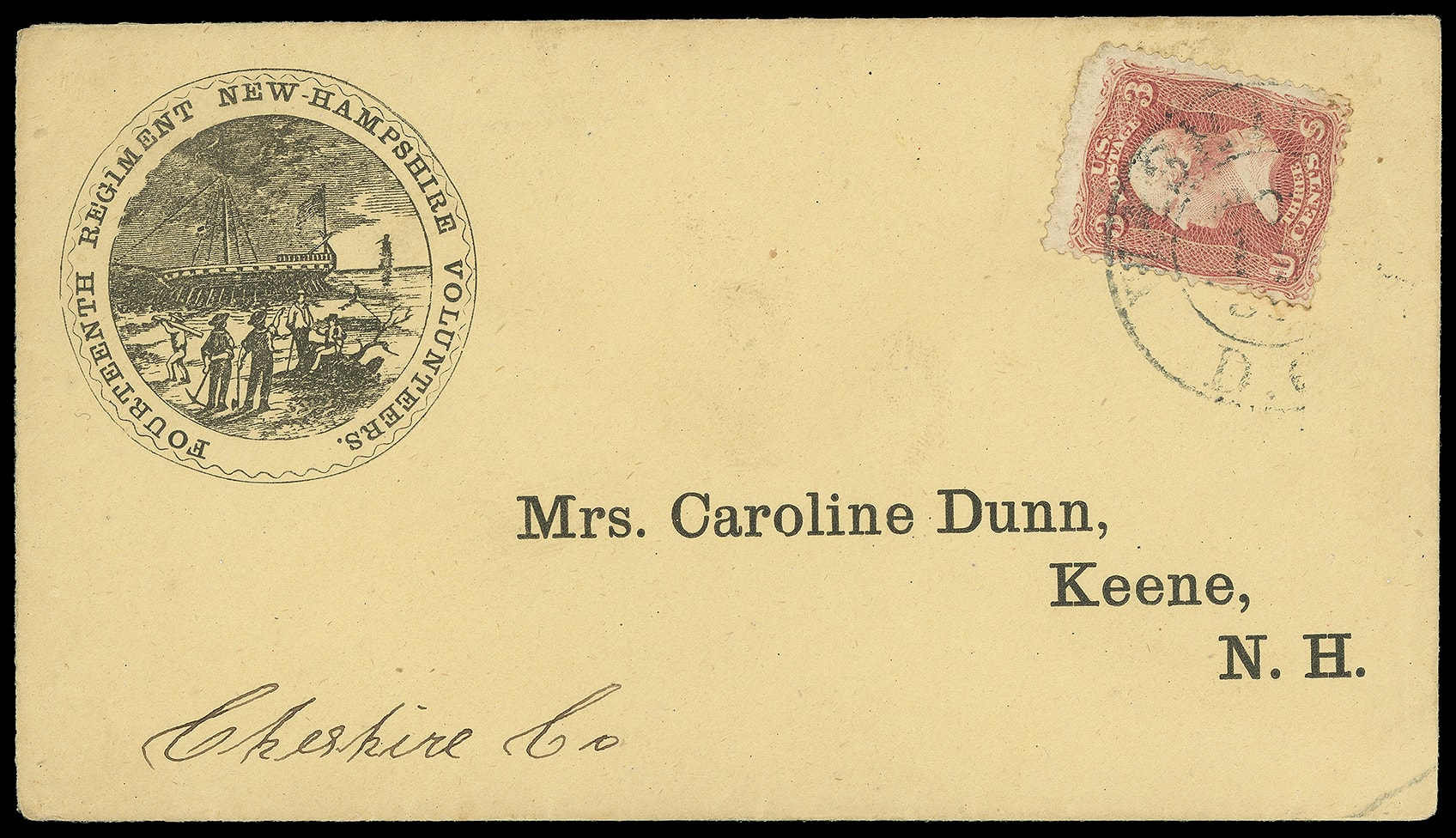 New-Hampshire Volunteers. Regimental patriotic design showing state seal on buff cover bearing 3¢ rose (65), short corner, tied by partial "Washington D.C. Oct 19" cds with preprinted address to Keene N.H., Very Fine. Walcott No.