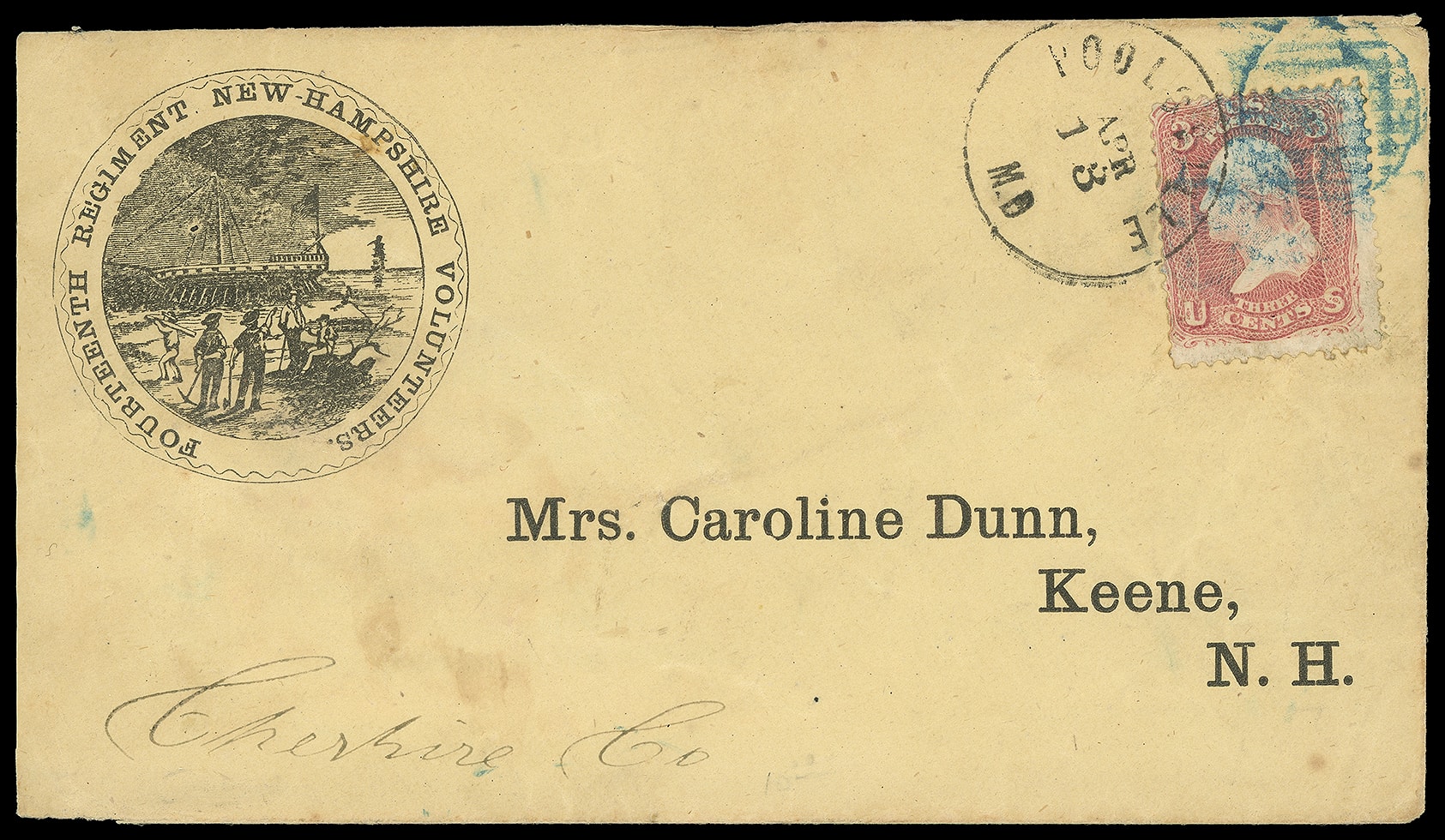 New-Hampshire Volunteers. Regimental patriotic design showing state seal on buff cover bearing 3¢ rose (65) tied by blue grids and "Poolsville Md. Apr 13" cds with preprinted address to Keene N.H., F.-V.F. Walcott No. 1358 var.;