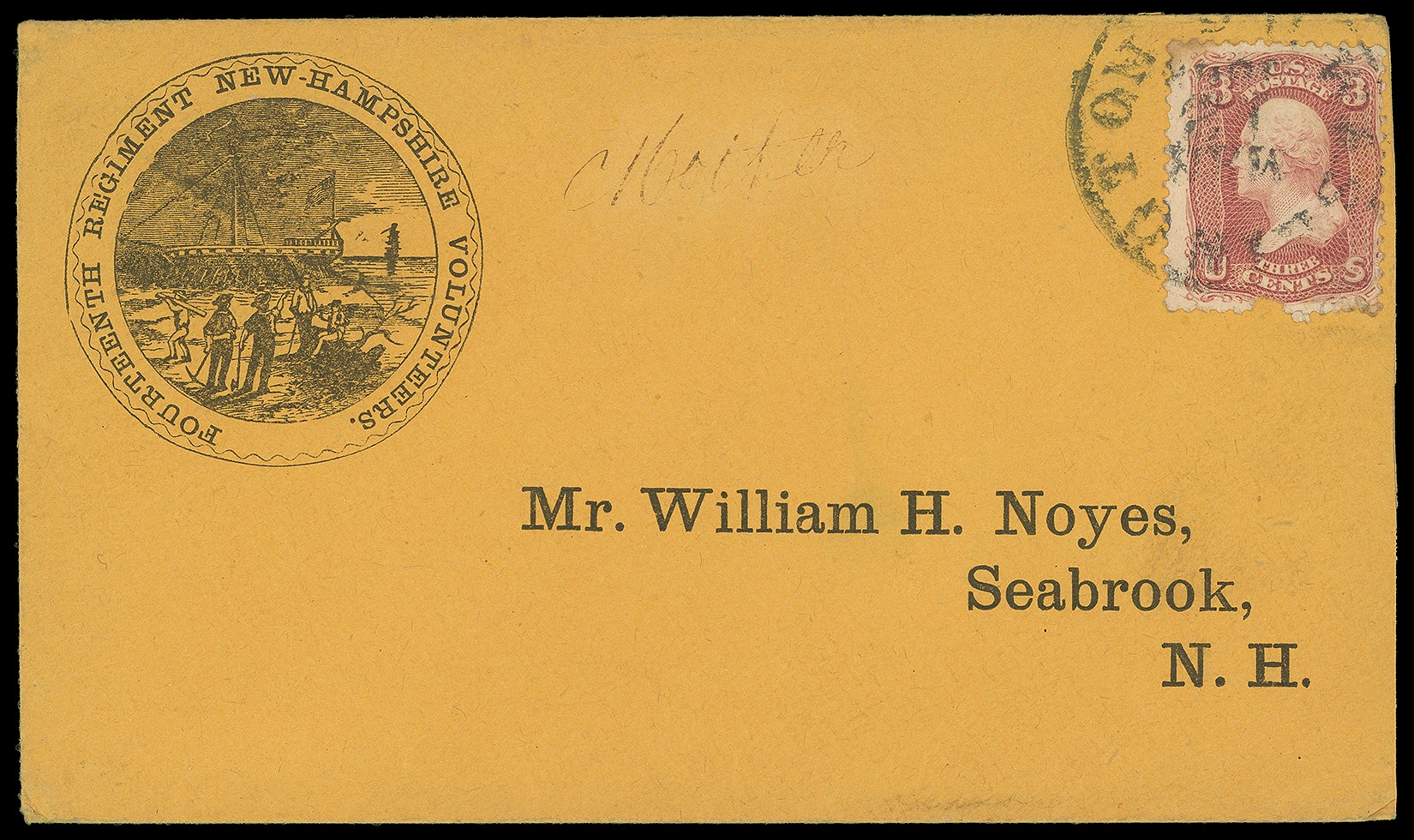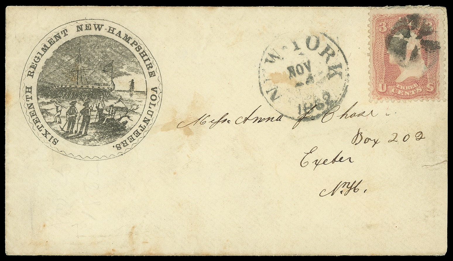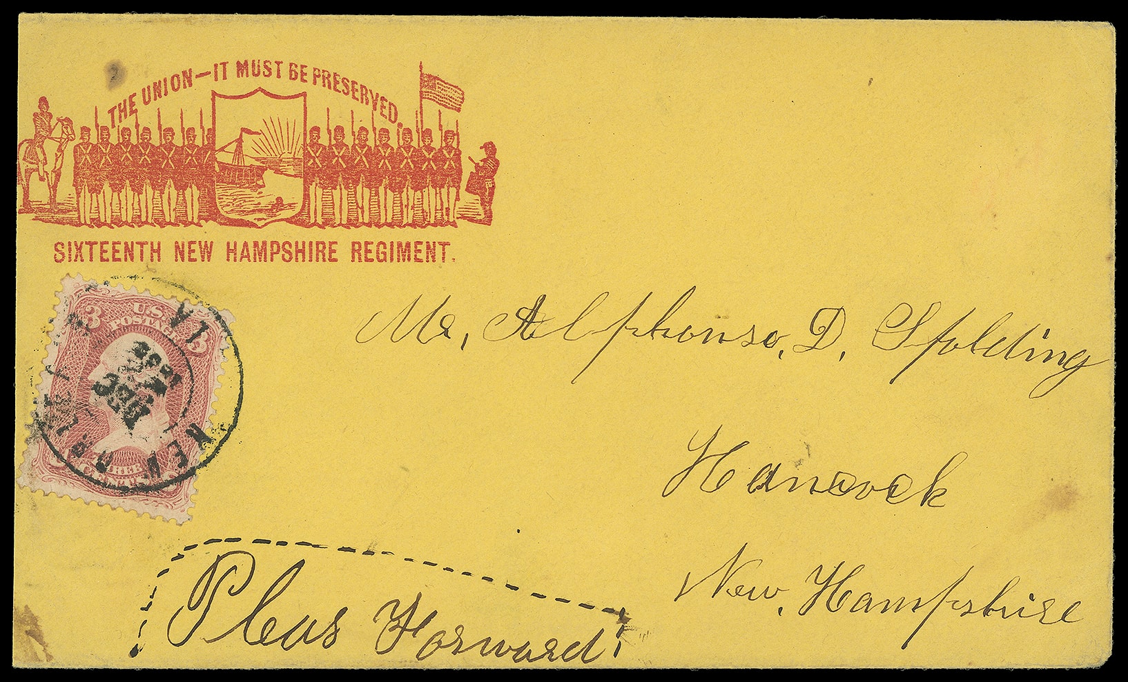 New-Hampshire Volunteers. Regimental patriotic design showing state seal on amber cover bearing 3¢ rose (65) canceled by cork duplexed with "New-York, Nov 23, 1862" cds to Exeter N.H.; reduced slightly at right with small edge tear,