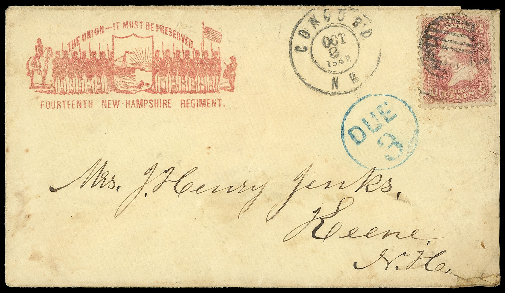 New-Hampshire Regiment. Red "The Union - It Must be Preserved" regimental patriotic on amber cover bearing 3¢ rose (65) tied by circular grid cancel, matching "Concord N.H. Oct 2, 1862" cds to Keene N.H., neat "Due 3" circular handstamp;