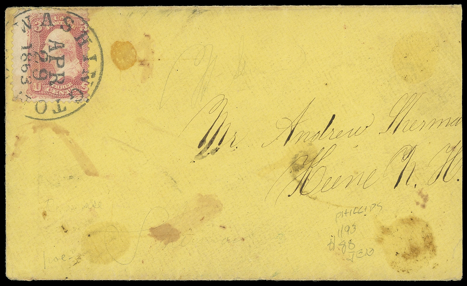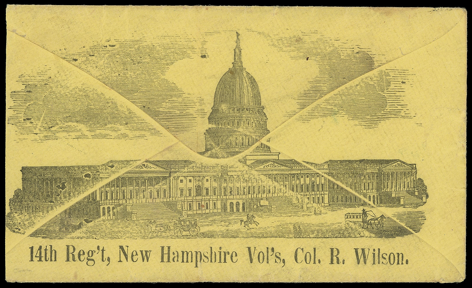 Hampshire Vol's, Col. R. Wilson. Overall U.S. Capitol patriotic design on reverse of yellow cover bearing 3¢ rose (65) tied by "Washington D.C. Apr 29, 1863" cds to Keene N.H., accompanied by original "14th Regiment New-Hamshire Volunteers"