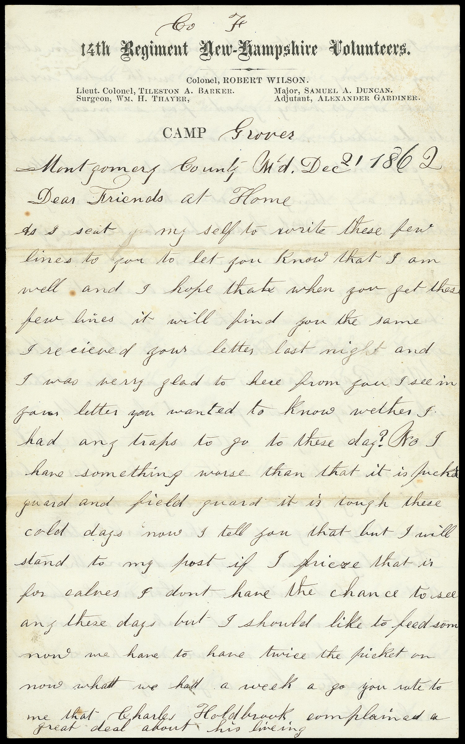 printed lettersheet listing officers, datelined "Camp Grover, Montgomery county Md., Dec 21, 1862" to friends at home saying he is well, on picket and guard duty, "…if I was at home I would never eat this provision that they