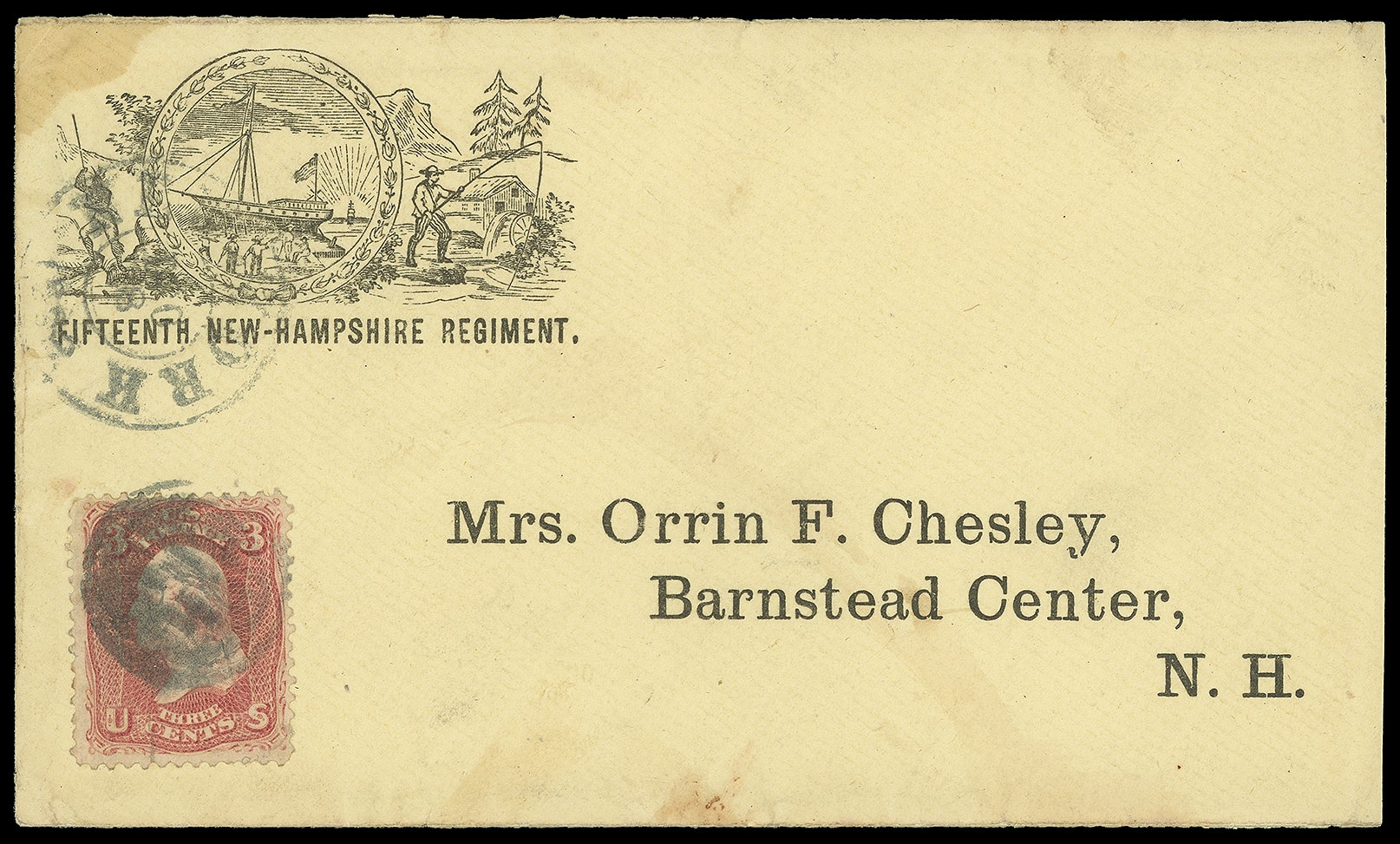 N.H.; top left corner stain, reduced slightly at right; accompanied by matching mint return patriotic envelope with preprinted address to Orrin F. Chesley, Co. B, 15th Reg. N.H. Volunteers, Washington D.C., F.-V.F. Walcott No. 1371;