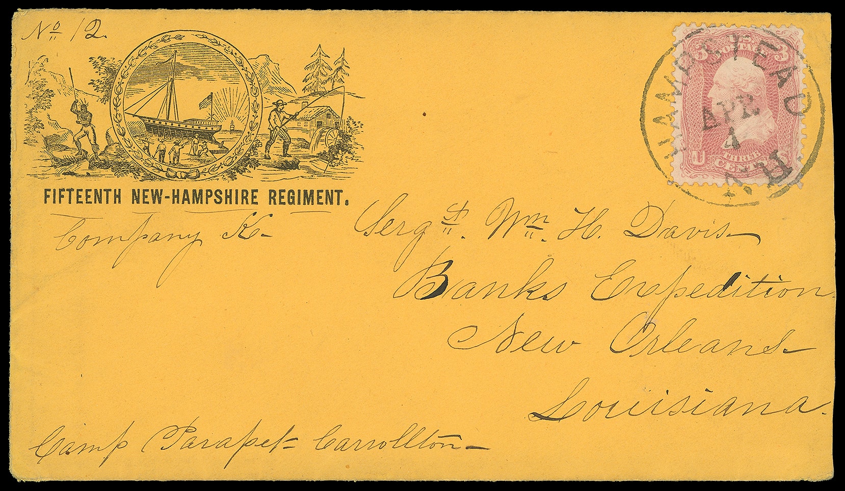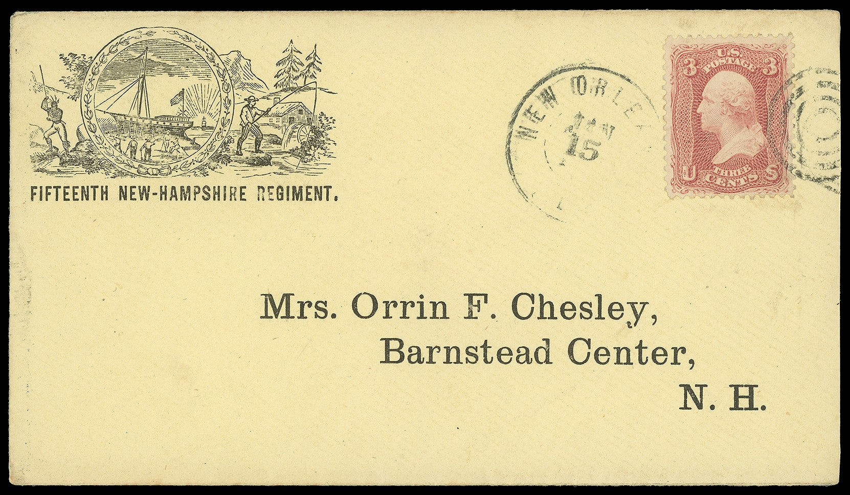 New-Hampshire Regiment. Regimental patriotic design showing State Seal and wilderness scene on amber cover bearing 3¢ rose (65) tied by "New Orleans La., Jan 15" duplex with target cancel with preprinted address to Barnstead Center N.H.;