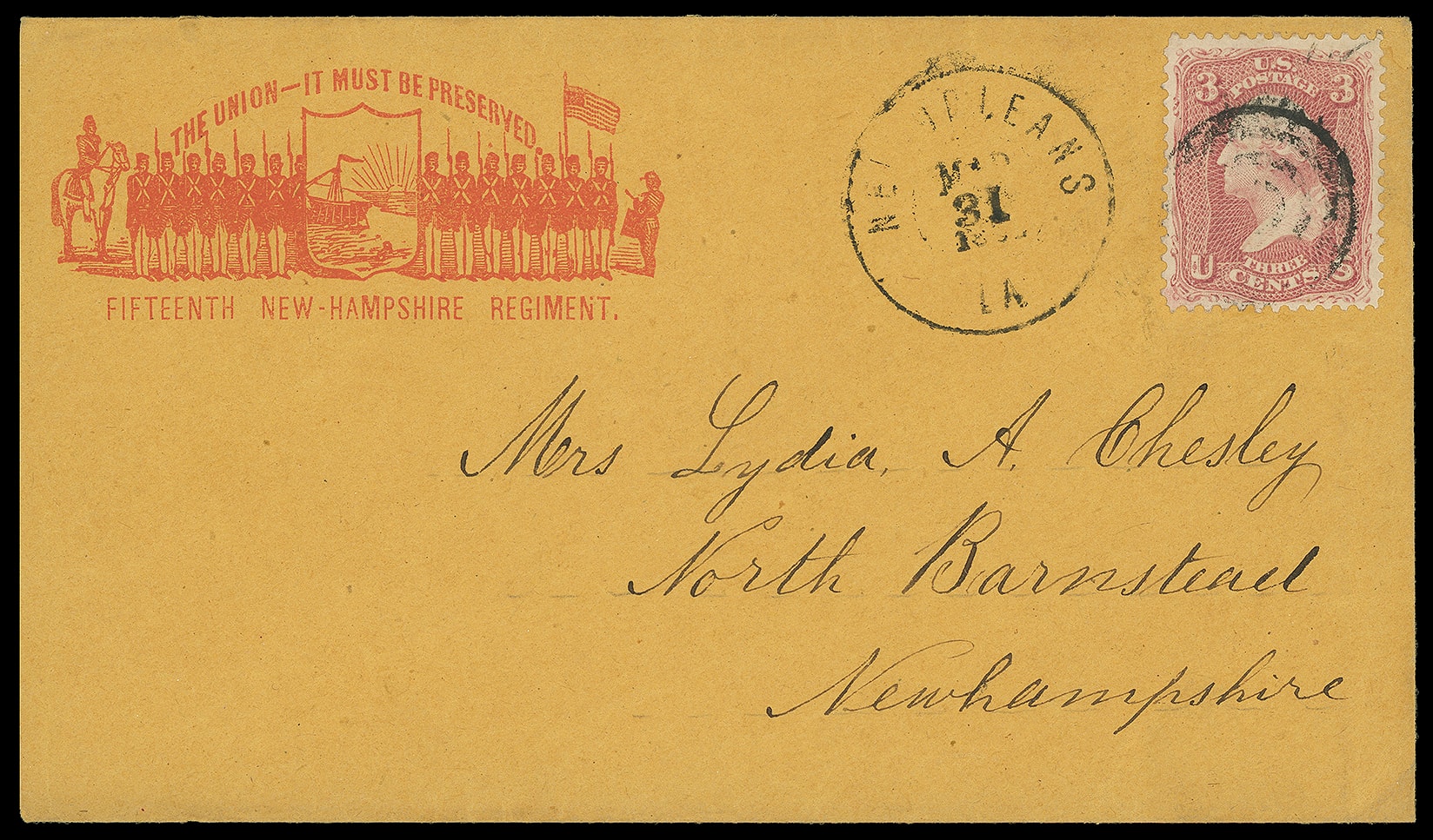 New-Hampshire Regiment. Red regimental "The Union - It Must be Preserved" patriotic design on orange cover bearing 3¢ rose (65) tied by four-ring cancel duplexed with "New Orleans, La., Mar 31, 1863" cds to North Barnstead N.H.; barely