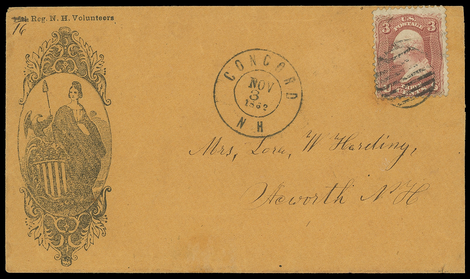 Volunteers. Regimental patriotic design showing Lady Liberty, Eagle and Shield on orange cover bearing 3¢ rose (65), small flaws, tied by circular grid cancel, matching "Concord N.H. Nov 3, 1862" cds to Acworth N.H.; reduced slightly at