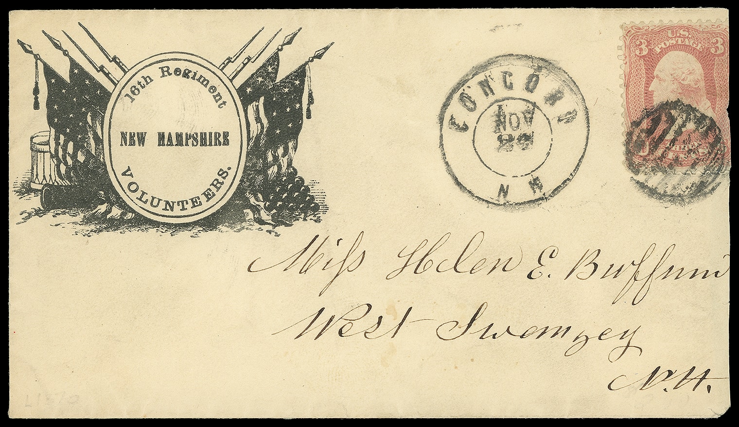 Hampshire Volunteers. Regimental draped flag patriotic design on cover bearing 3¢ rose (65) tied by circular grid cancel, matching "Concord N.H. Nov 20" cds to West Swanzey N.H.; reduced at right trimming 3¢, Fine. Walcott