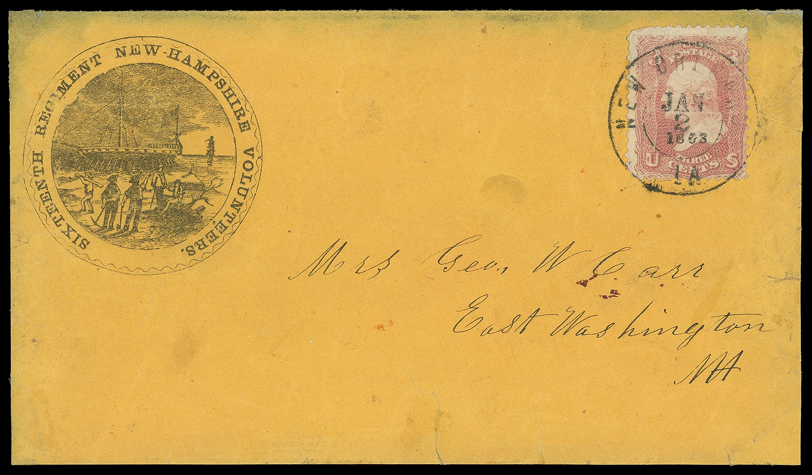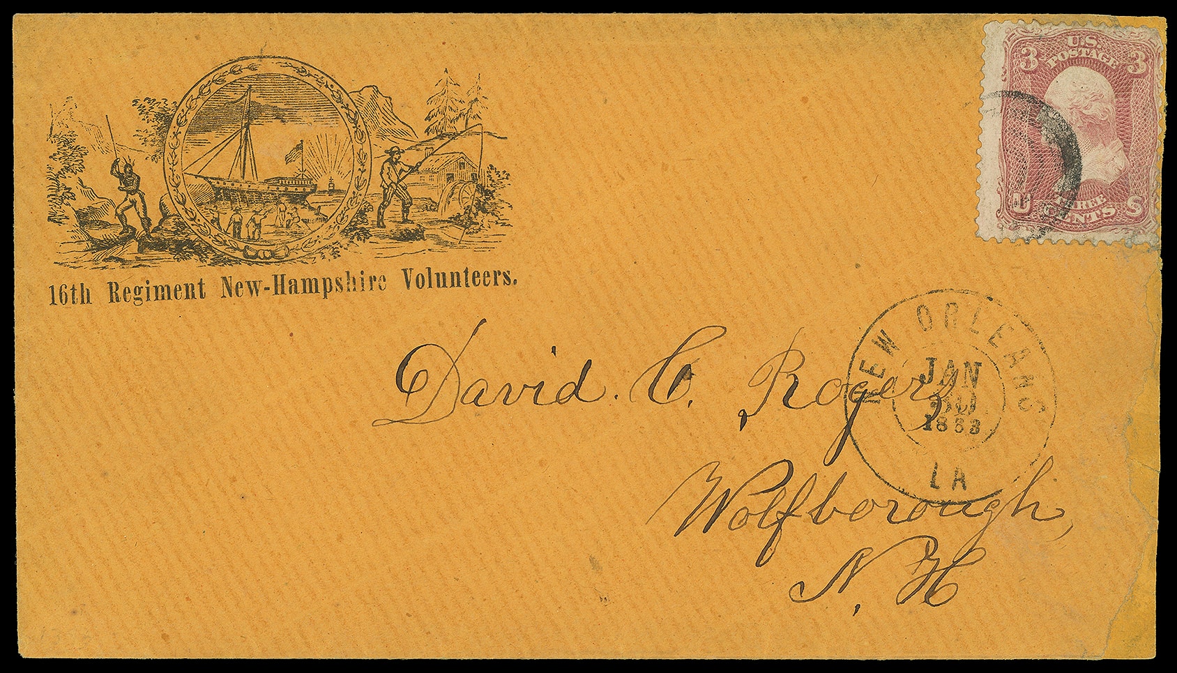 New-Hampshire Volunteers. Regimental patriotic design showing state seal on orange cover bearing 3¢ rose (65), small tear, tied by "New Orleans La., Jan 2, 1863" cds to East Washington N.H.; reduced slightly at right, edge tears,