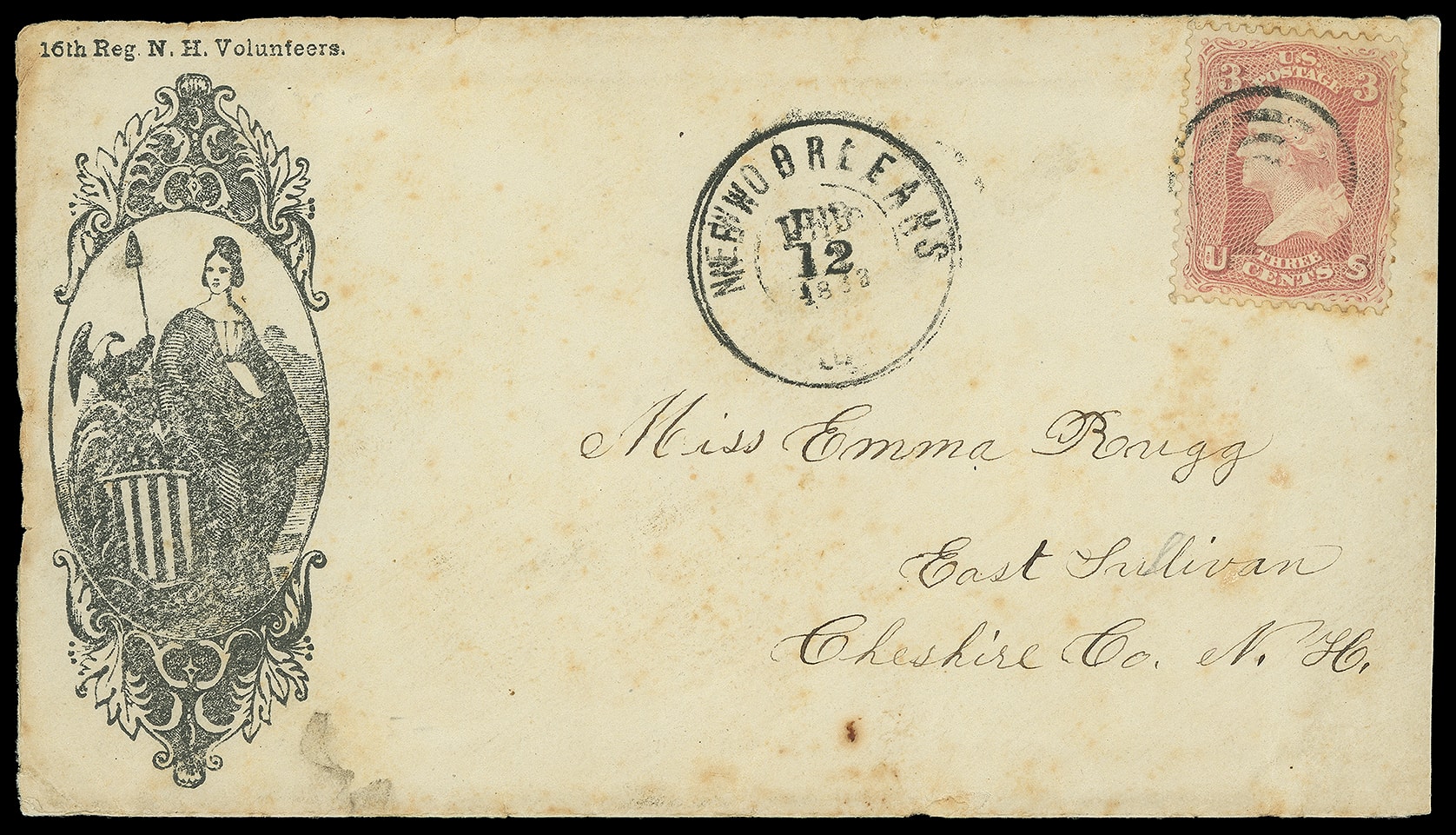 Volunteers. Regimental patriotic design showing Lady Liberty, Eagle and Shield on cover bearing 3¢ rose (65), tied by partial four-ring target, matching "New Orleans La., Feb 12, 1863" cds to East Sullivan N.H.; cover front and back