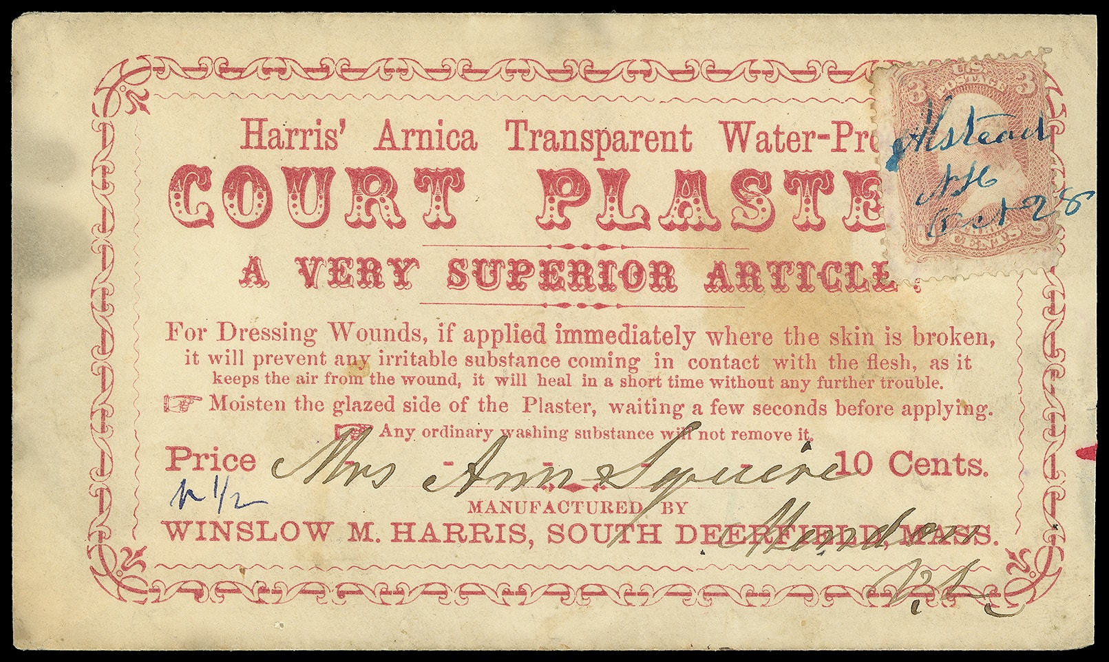 Arnica Transparent Water-Proof Court Plaster, Winslow M. Harris, South Deerfield Mass. Red overall ad on cover bearing 3¢ rose (65) tied by blue ms. "Alstead NH, Oct 25" postmark to Mendon, Vermont; reduced slightly at right, some soiling
