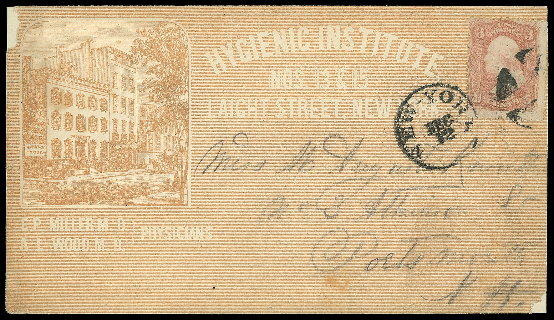 Institute, New York N.Y. Orange overall illustrated building ad with D.H. Prime flap imprint on cover bearing 3¢ rose (65), small tear, tied by segmented cork duplexed with "New-York, Dec 12" cds to Portsmouth N.H.; reduced at right, some