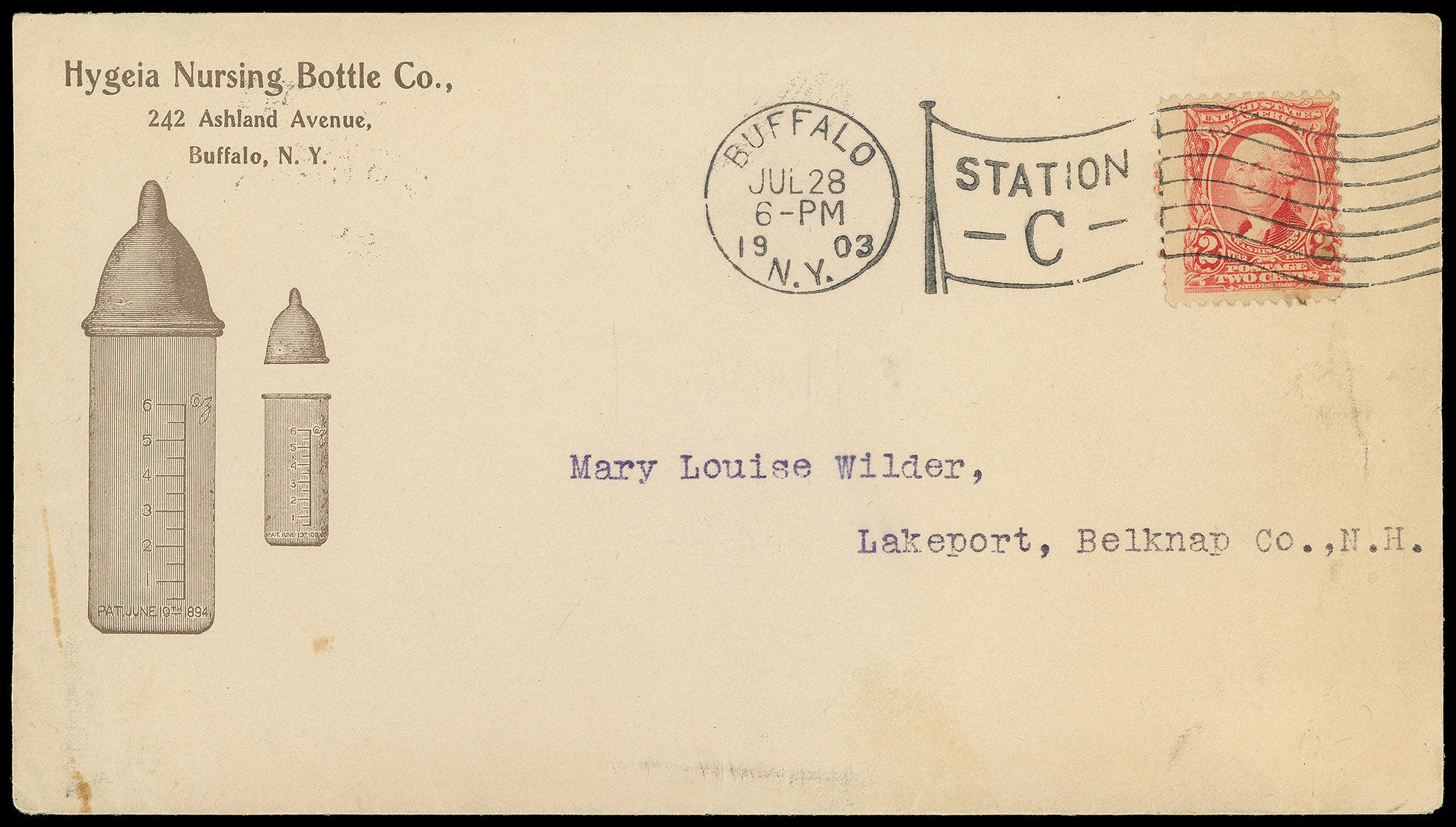 Nursing Bottle Co., Buffalo N.Y. Illustrated ad showing baby bottles on cover bearing 2¢ carmine (301) tied by "Buffalo N.Y. Jul 28, 1903" Station C ovate flag machine cancel to Lakeport N.H., Jul. 2nd arrival backstamp, Very