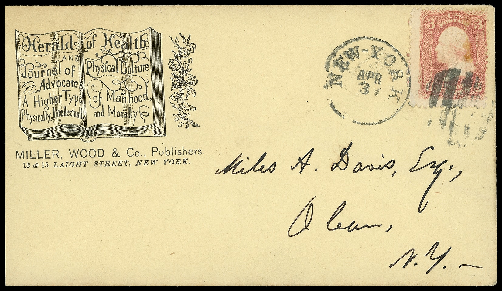 Health, Wood & Holbrook Publishers, New York N.Y. Illustrated corner card showing open book on amber cover bearing 3¢ rose (65) tied by grid cancel duplexed with "New-york, apr 3" cds to Oleans N.Y., fresh and Very Fine. Estimate;
