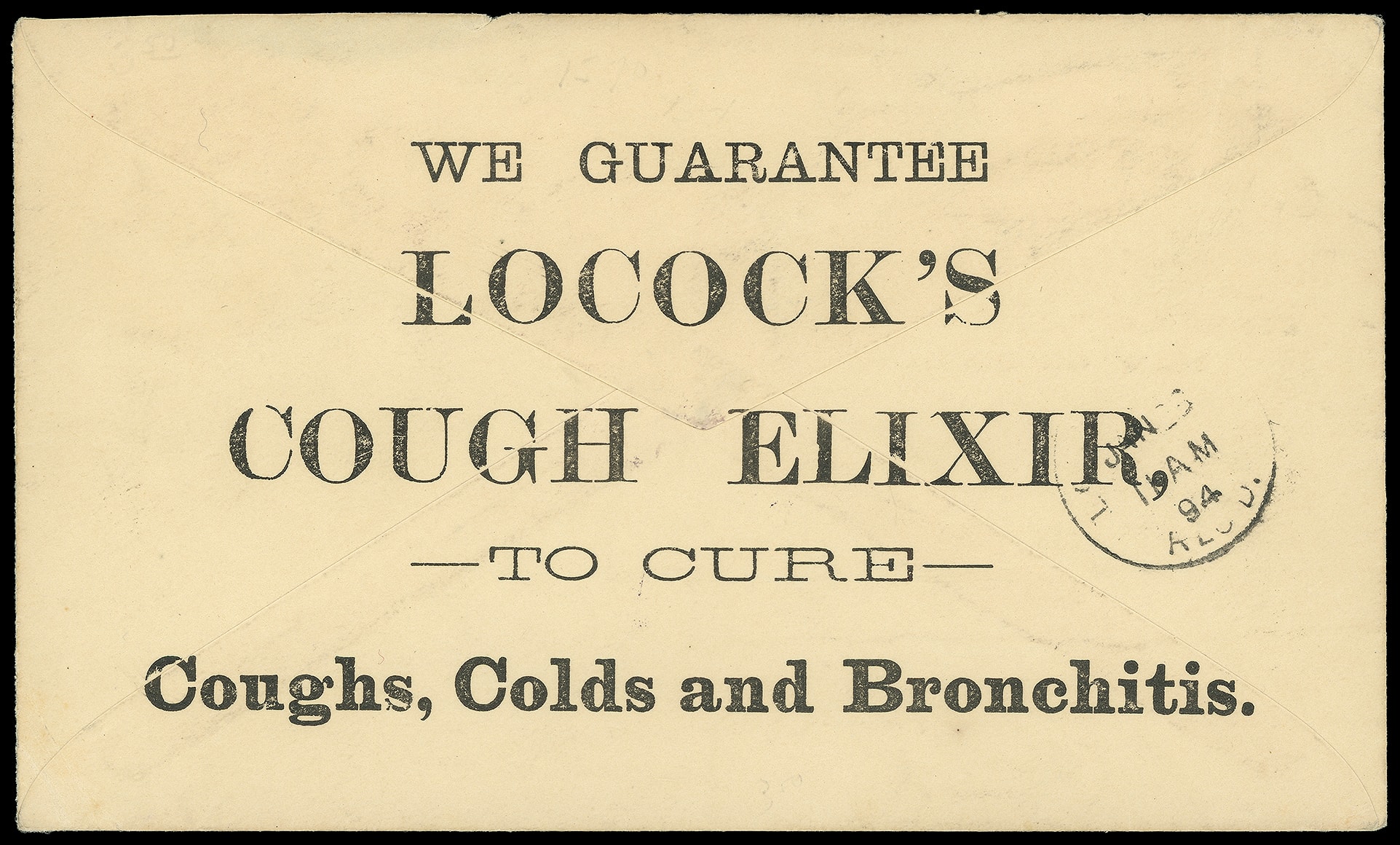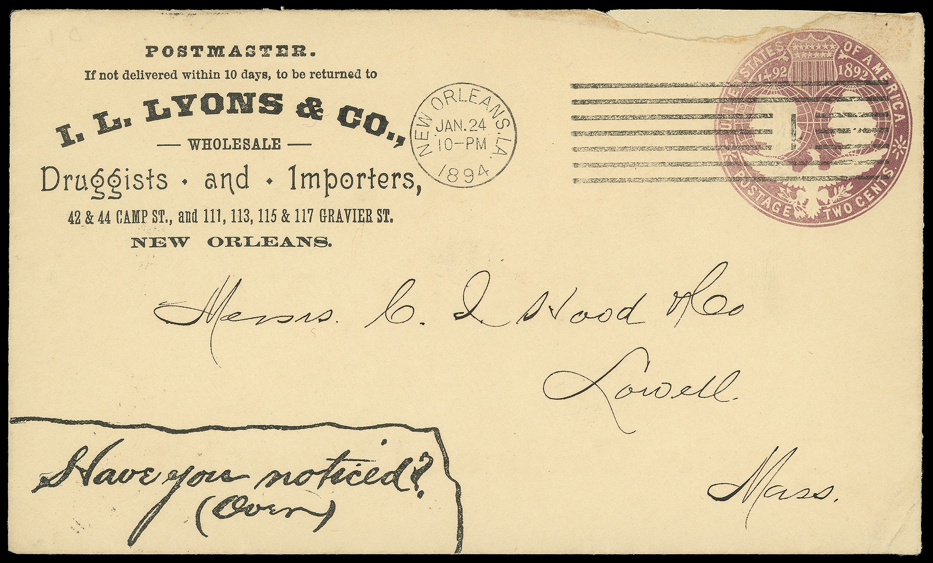 & co., Wholesale Druggists and Importers, New Orleans La. Corner card with printed "Have you noticed? (over) and reverse with overall "We Guarantee Locock's Cough Elixer, to cure Coughs, Colds and Bronchitis" text on 2¢ Columbian (U349)