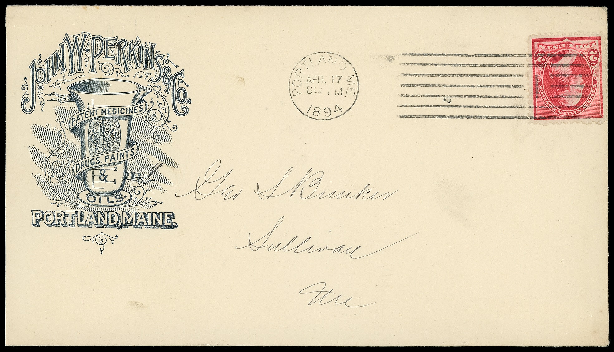 Perkins & Co., Patent Medicines, Portland Me. Illustrated corner card showing container on cover bearing 2¢ carmine (220) tied by "Portland Me. Apr 17, 1894" machine cancel to Sullivan Me.; reduced slightly at left, fresh and Very