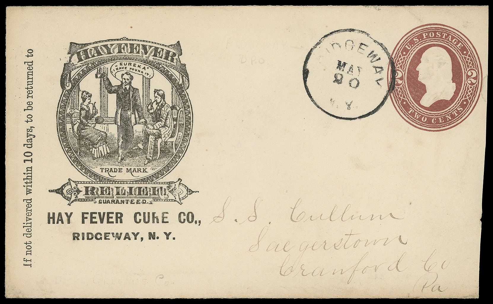 Relief Guaranteed, Hay Fever Cure Co., Ridgeway N.Y. Illustrated trademark corner card showing man proclaiming "Eureka, I have found it!" and patients on 2¢ red brown (U277) entire canceled by "Ridgeway N.Y. May 20" cds to Saegerstown Pa.;