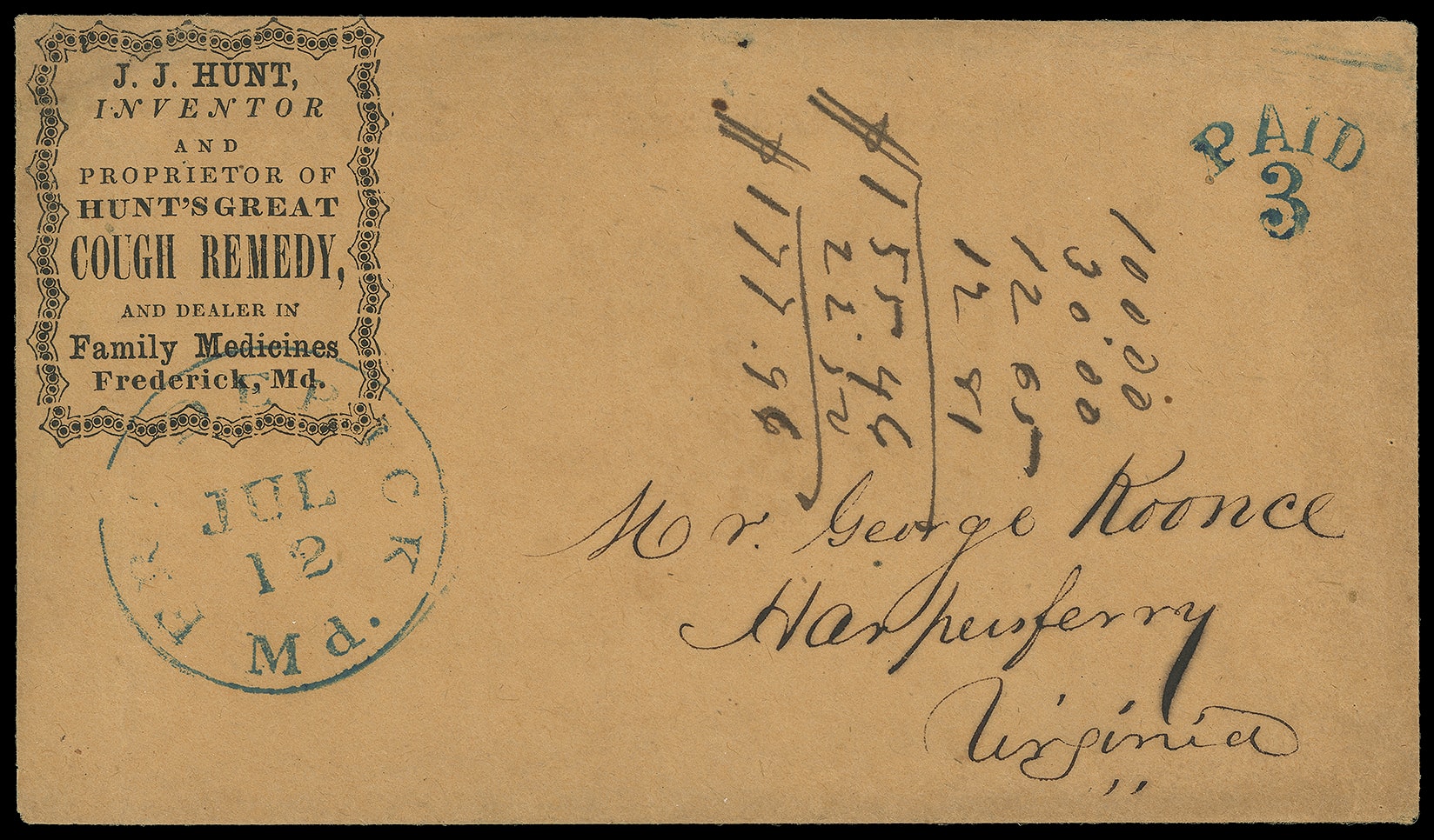 Great Cough Remedy, Family Medicines, Fredrick Md. Ornate boxed advertising on amber stampless cover with blue "Frederick Md. Jul 12" cds and matching "Paid 3" arc handstamp to Harpers Ferry, Virginia, original 1855 letter; light horizontal