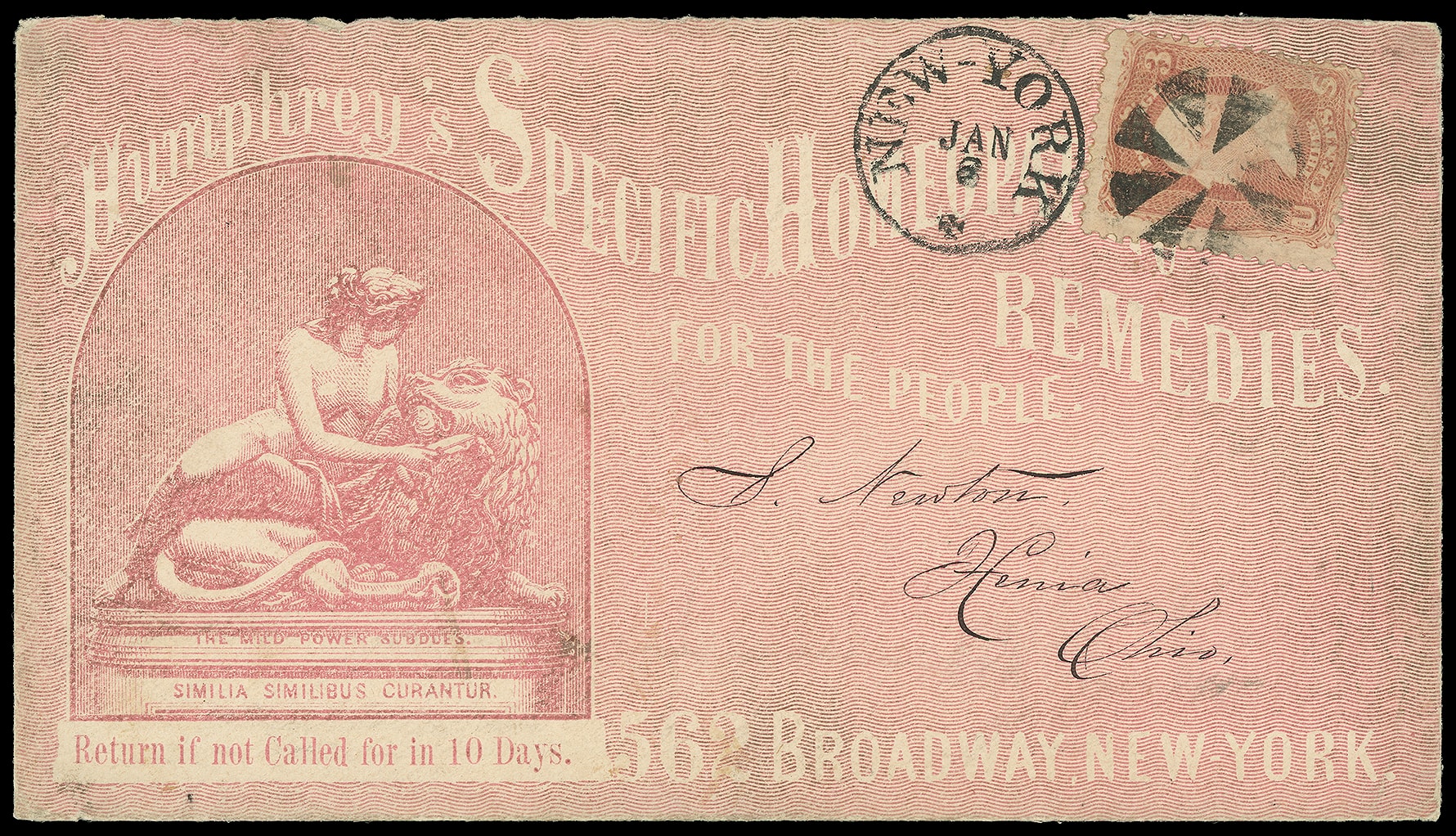 Humphrey's Specific Homeopathic Remedies, New York N.Y. Overall red illustrated advertising showing Woman caressing a Lion, John W. Orr Envelope Mfg. flap imprint on cover bearing 3¢ rose (65) tied by circle of wedges duplexed with