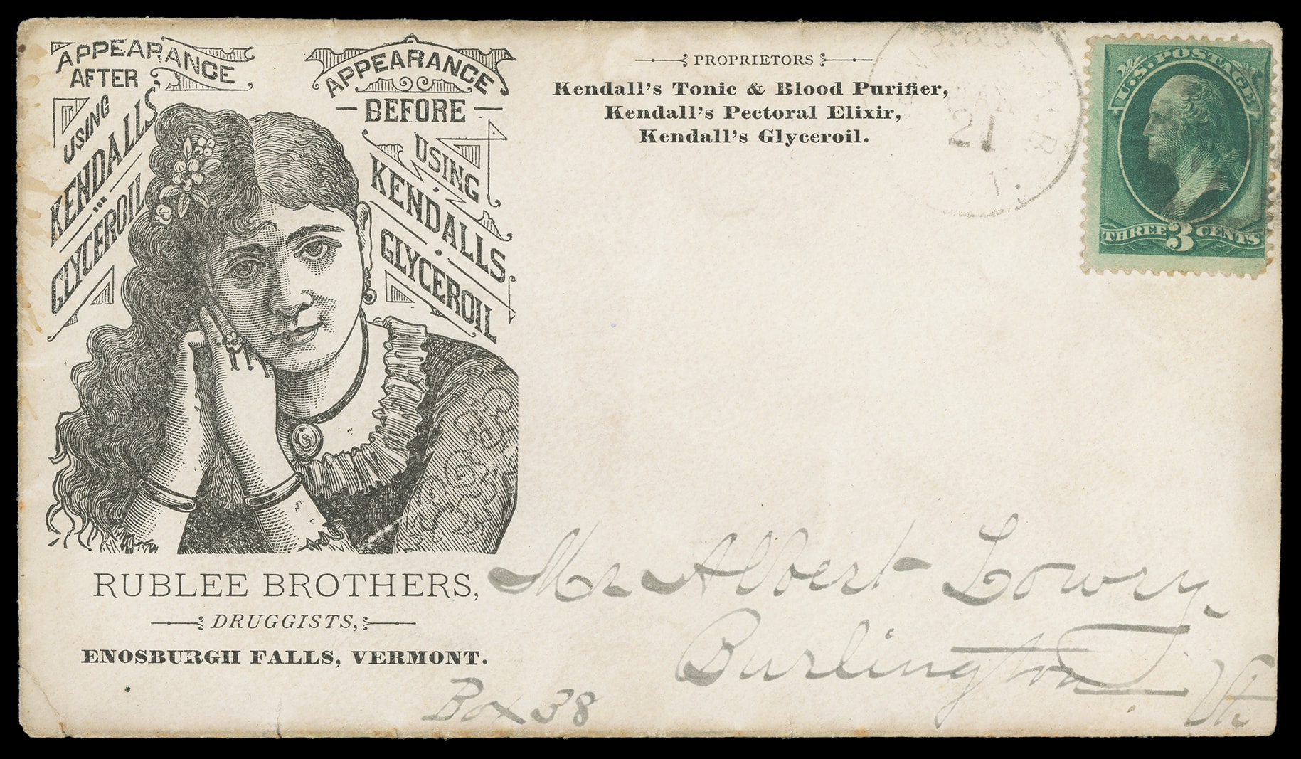 Glyceroil, Rublee Brothers Druggists, Enosburgh Falls VT. Illustrated advertising showing woman on cover bearing 3¢ green (184) tied by negative "W" cancel duplexed with instinct "Newp. & St. Alb. Agt. May 21" railroad agent cds