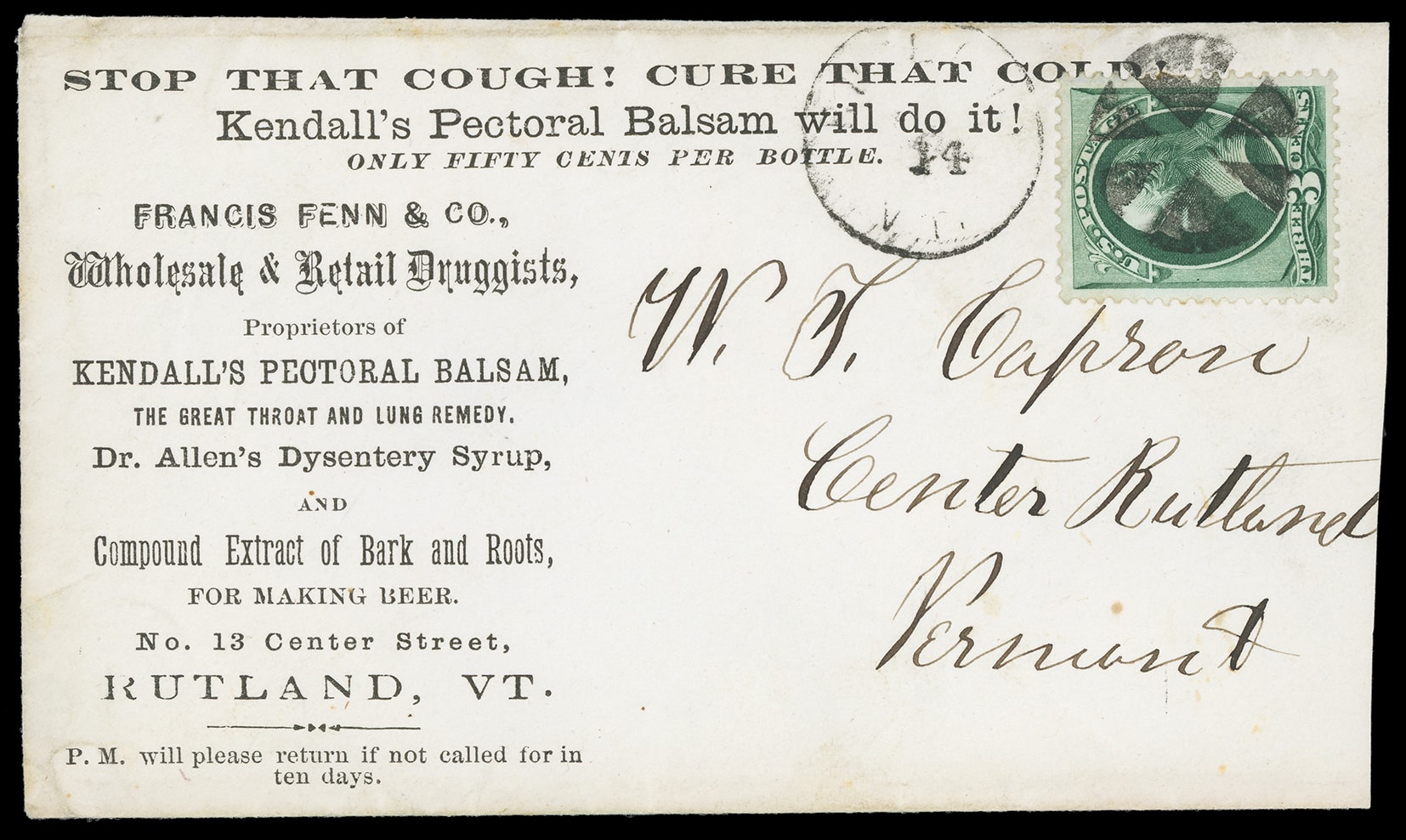 Pectoral Balsam Will Do It, Francis Fenn & Co., Rutland, Vt. Printed advertising on cover bearing 3¢ green (158) well centered, tied by neat circle of wedges cancel duplexed with "Rutland Vt." cds to Center Rutland Vt.; reduced at