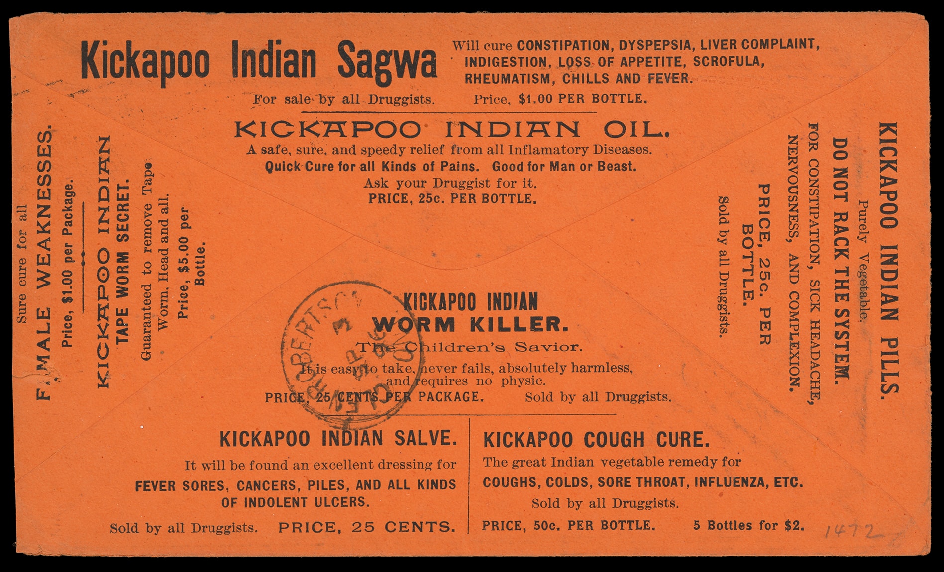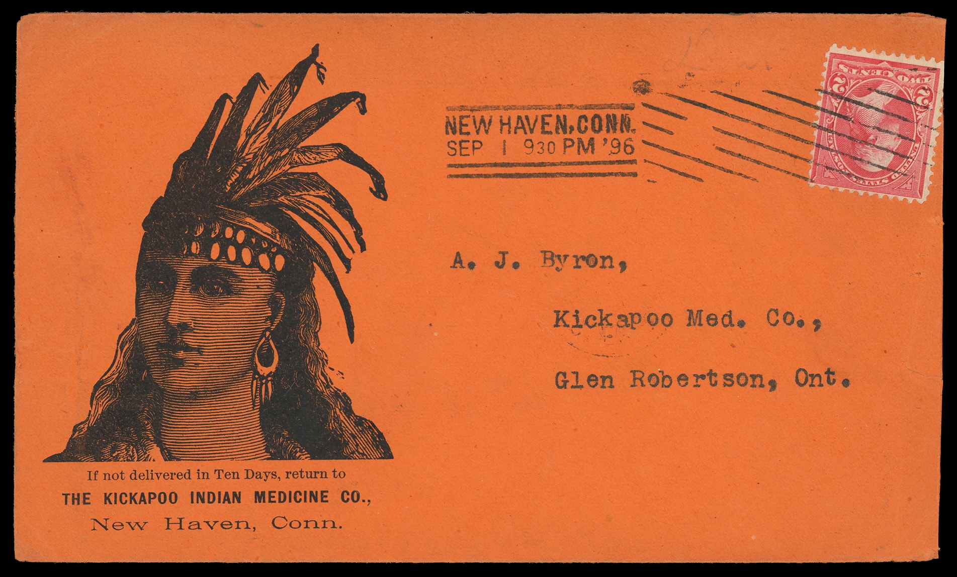 Kikapoo Indian Medicine Co, New Haven, Conn. Large illustrated advertising showing Indian Maiden with additional advertising text on reverse listing various "Indian" medicines on 1896 dark orange cover bearing 2¢ carmine (267) tied by "New