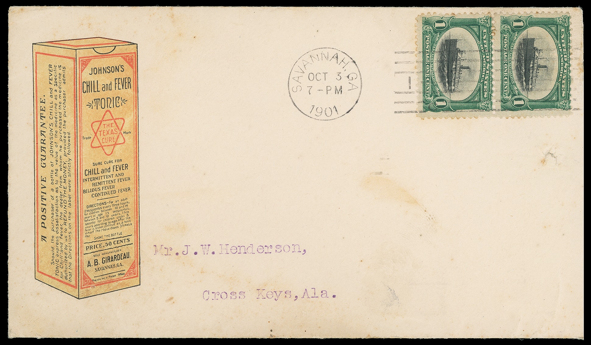 Chill and Fever Tonic, A.B. Girardeau, Savannah Ga. Bicolor illustrated advertising showing medicine box for "The Texas Cure" on cover bearing 1¢ Pan-American (294) vertical pair tied by "Savannah, Ga. Oct 3, 1901" machine cancel to