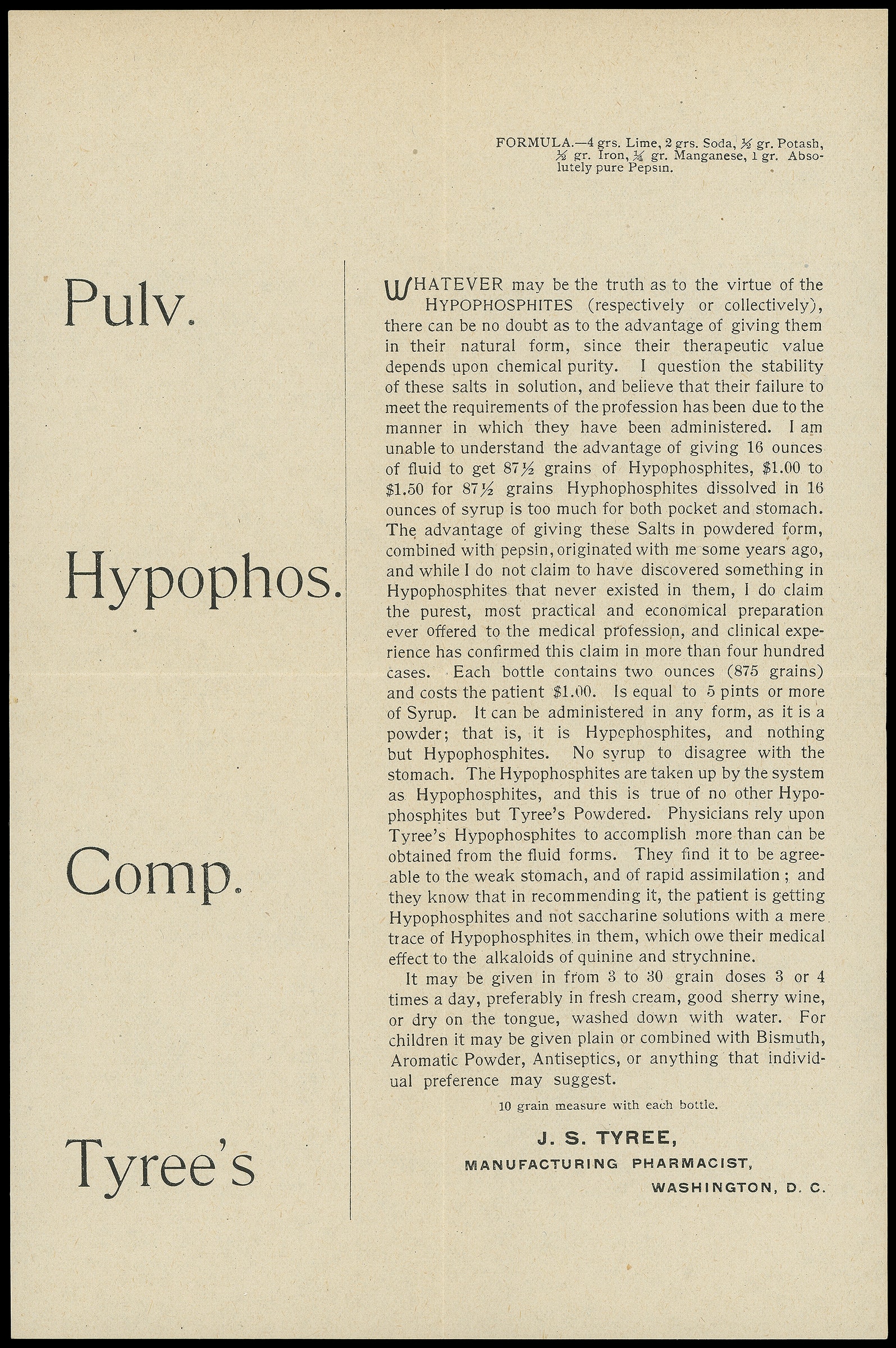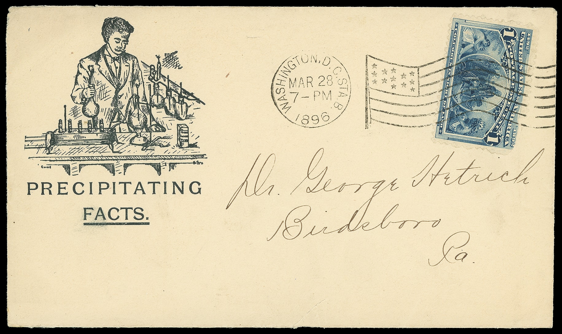 Tyreee, Manufacturing Pharmacist, Washington D.C. Printed enclosures and illustrated corner card showing pharmacist in laboratory on cover bearing 1¢ Columbian (230) tied by "Washington D.C. Mar 28, 1896" ovate flag machine cancel to