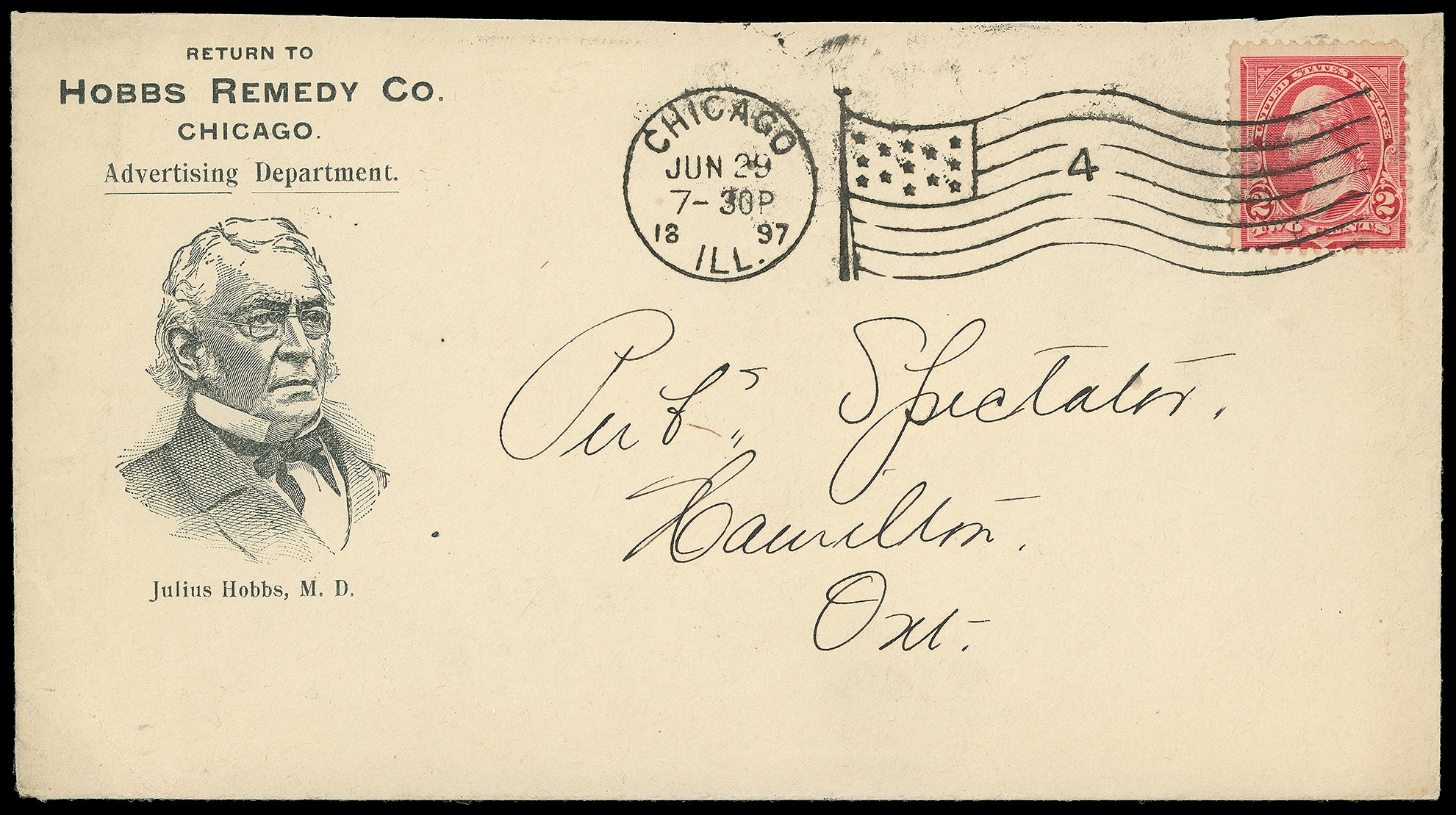 Remedy Co., Julius Hobbs M.D., Chicago Ill. Illustrated advertising design showing Hobbs on cover bearing 2¢ carmine (279B) tied by "Chicago Ill. Jun 29, 1897" flag machine cancel to Hamilton, Ontario, Canada, Jun. 30th arrival backstamp;