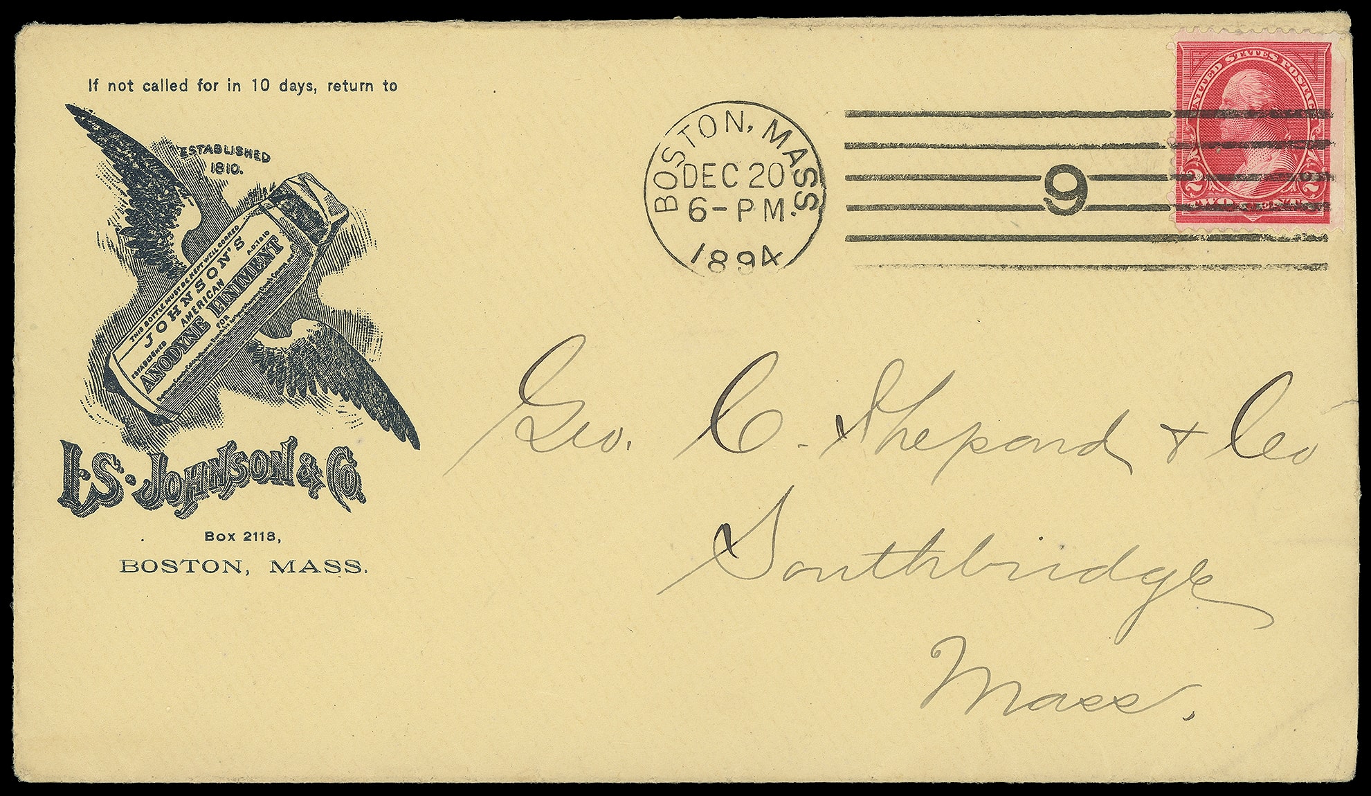 Anodyne Liniment, L.S. Johnson & Co., Boston Mass. Illustrated ad design showing medical bottle with wings on amber cover bearing 2¢ carmine (250) tied by "Boston, Mass. Dec 20, 1894" machine cancel to Soutbridge Mass.; reduced slightly at