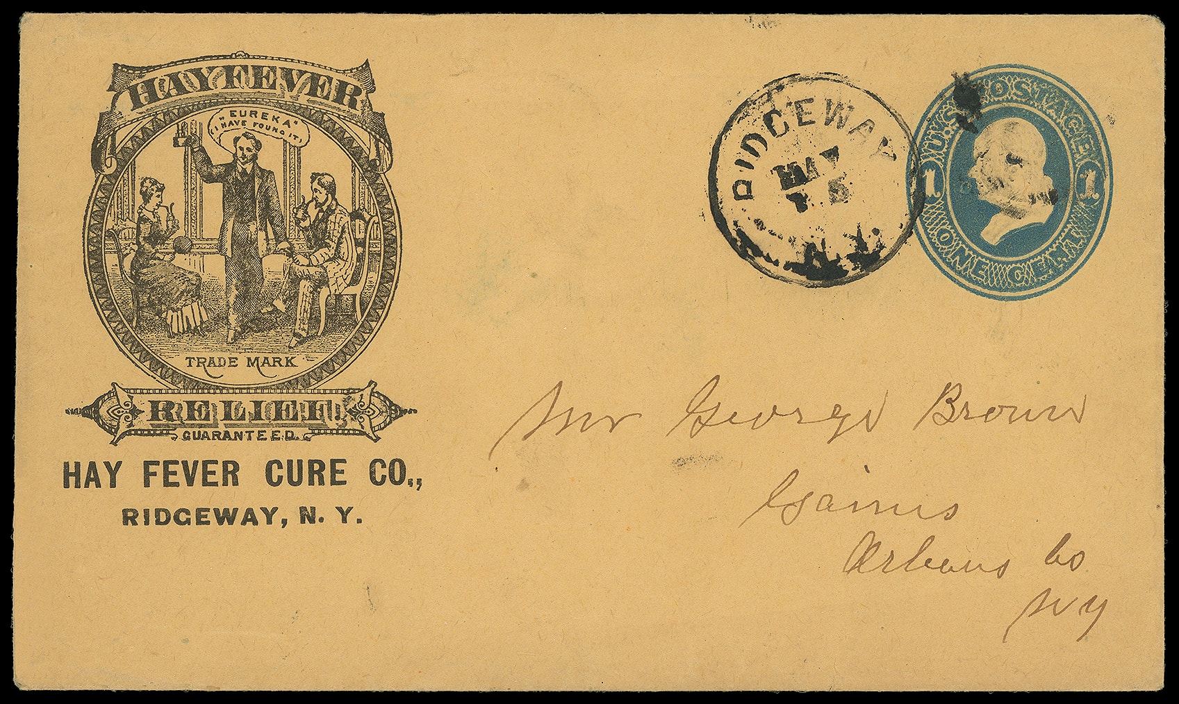 Relief, Hay Fever Cure Co., Ridgeway N.Y. Illustrated corner card showing Man saying "Eureka (I have found it)" flanked by Man and Woman taking the cure on 1¢ blue entire canceled by "Ridgeway N.Y. May 15" cds to Gains N.Y., Very