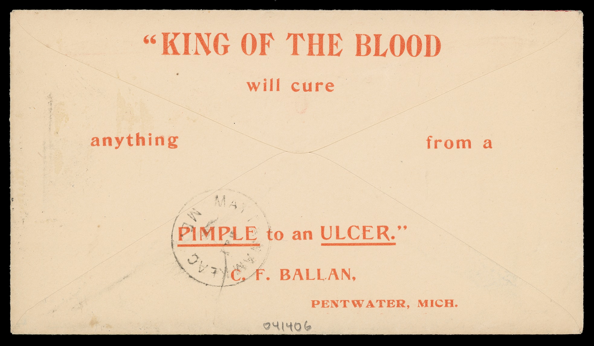 the Blood, C.F. Ballan, Penwater Mich. Overall Spanish American War patriotic design with red advertising text on reverse "King of the Blood will cure anything from a Pimple to an Ulcer" of unsealed cover bearing 1¢ blue (264) tied by