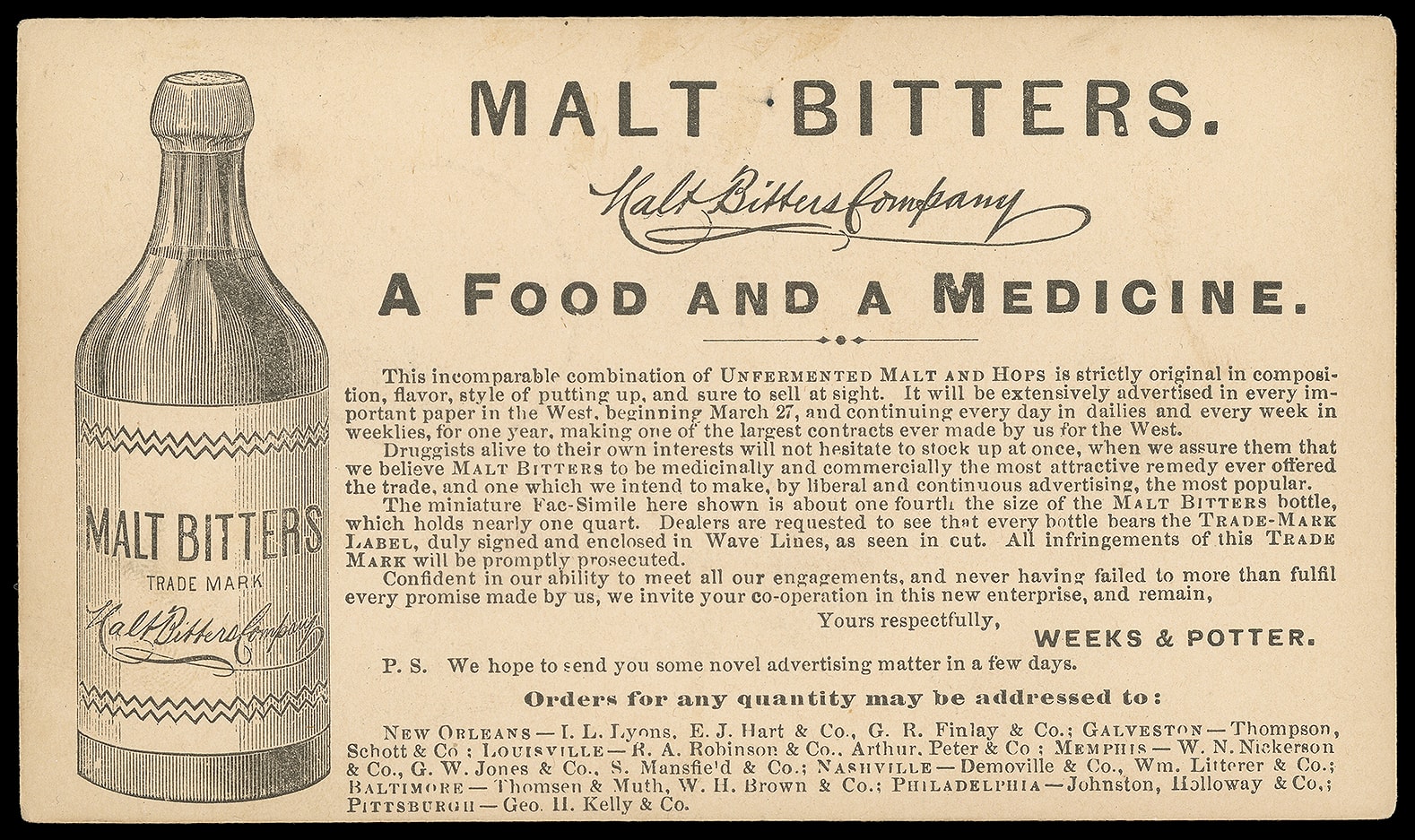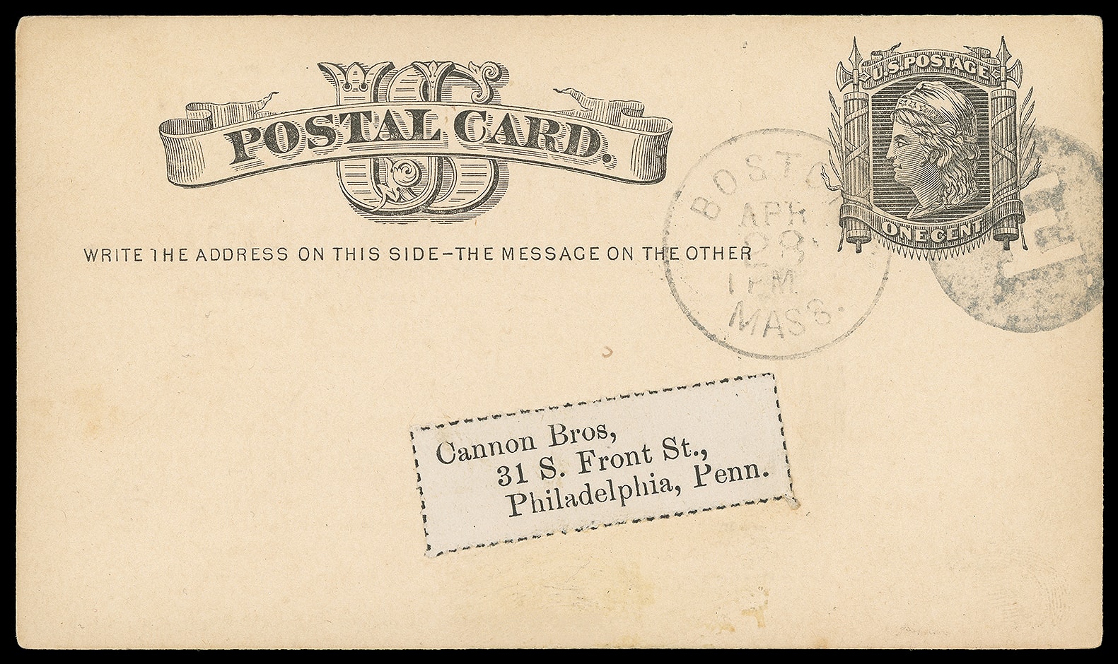 Bitters, Malt Bitters Co., Weeks & Potter. Illustrated advertisement showing bottle on reverse of 1¢ postal card (UX5) canceled by "Boston Mass. Apr 28" duplex with negative "E" in circle cancel with address label to Philadelphia Pa.,