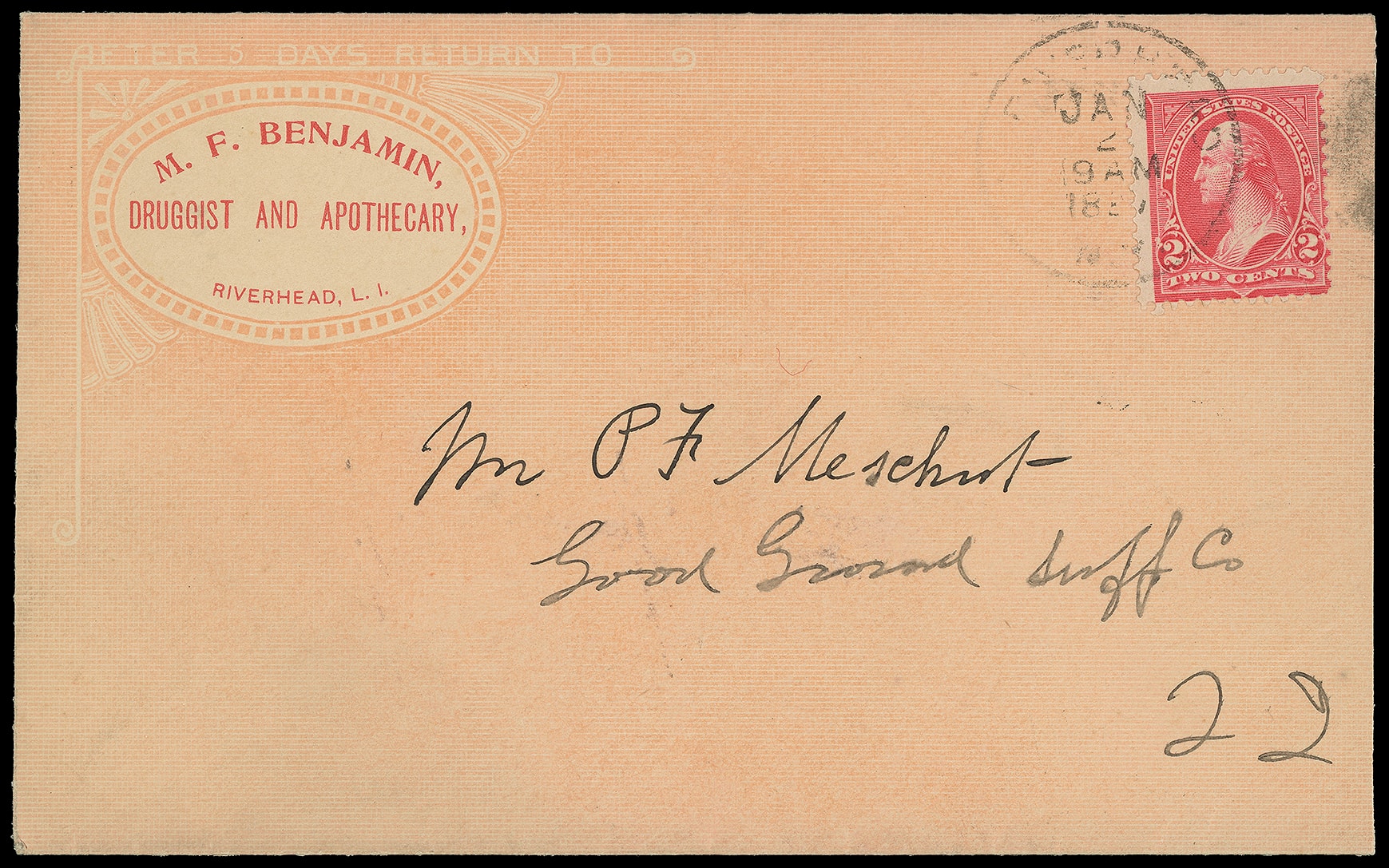 Benjamin, Druggist and Apothecary, Riverhead, Long Island. Overall orange shaded advertising cover bearing 2¢ rose carmine (279Bc) tied by "Riverhead N.Y., Jan 2, 1897" duplex to Good Grounds, Long Island N.Y., Jan. 2nd arrival backstamp;