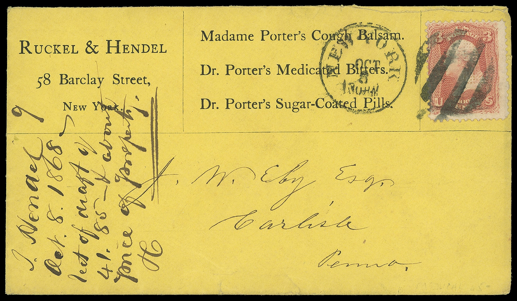 Porter's Cough Balsam, Dr. Porter's Medicated Bitters, Ruckel & Hendel, New York City. Advertising with stamp box on yellow cover bearing 3¢ rose red (94) tied by four-bar circular grid duplexed with "New York, Oct 8" cds to Carlisle Pa.,
