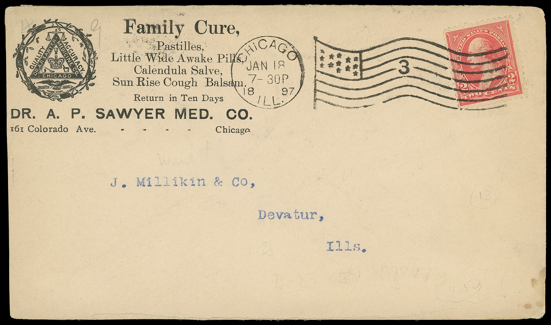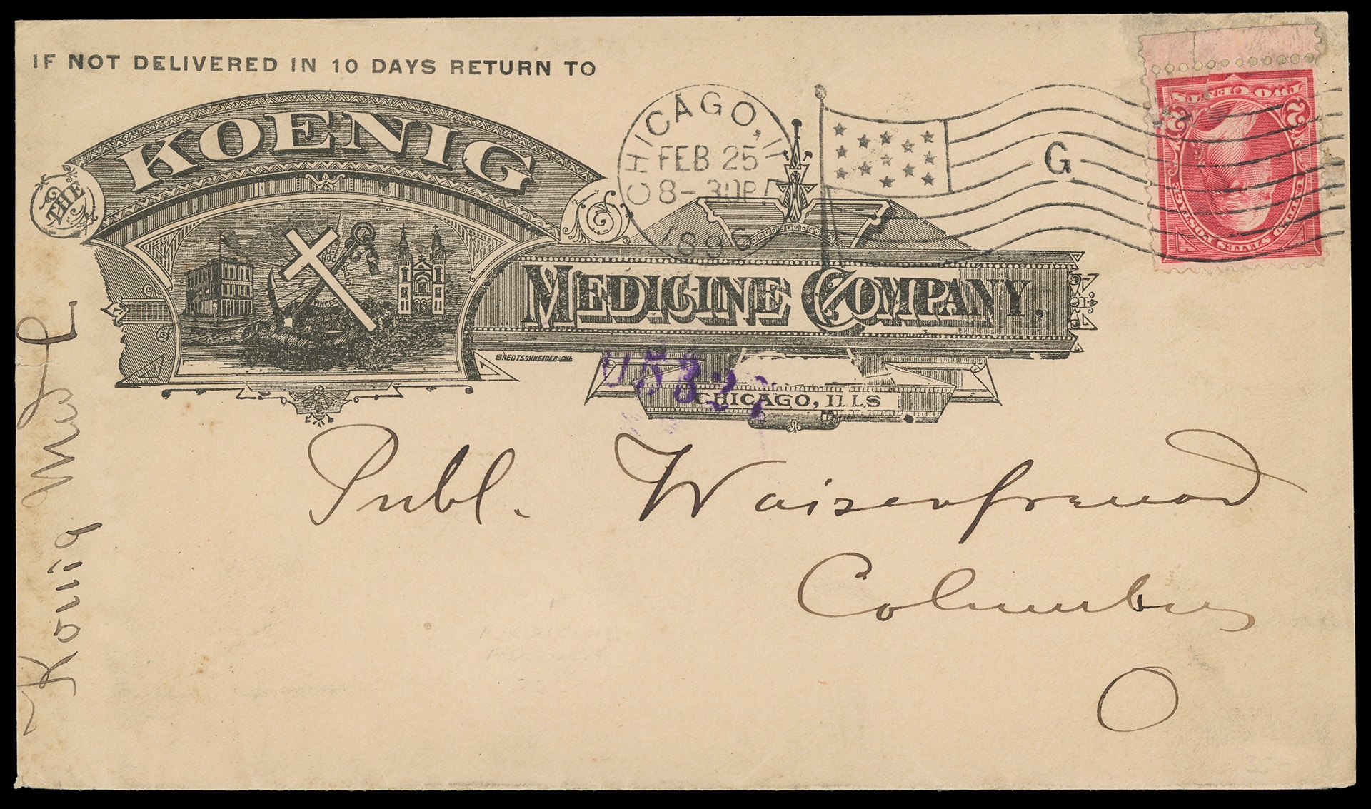 Medicine Company, Chicago Ill. Illustrated advertising on amber cover bearing 2¢ red (279B) tied by "Chicago Ill feb 25 1906" flag cancel to Columbus Ohio; stamp faulty from canceling machine, still, Very Fine cover. Estimate; $75