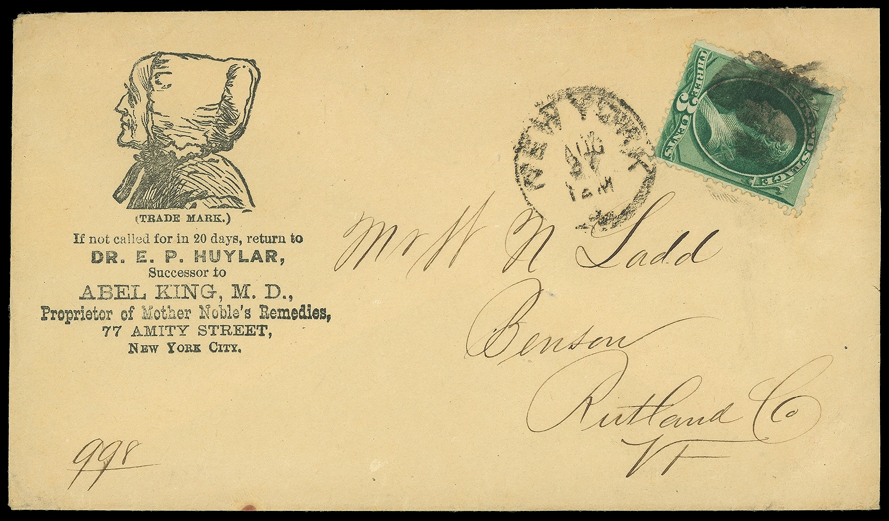 Noble's Remedies, Dr. E.P. Huylar, New York City. Illustrated ad design showing Mother Noble trademark on buff cover bearing 3¢ green (158) tied by cork cancel duplexed with "New York, A, Aug 27" cds to Benson Vt., Very