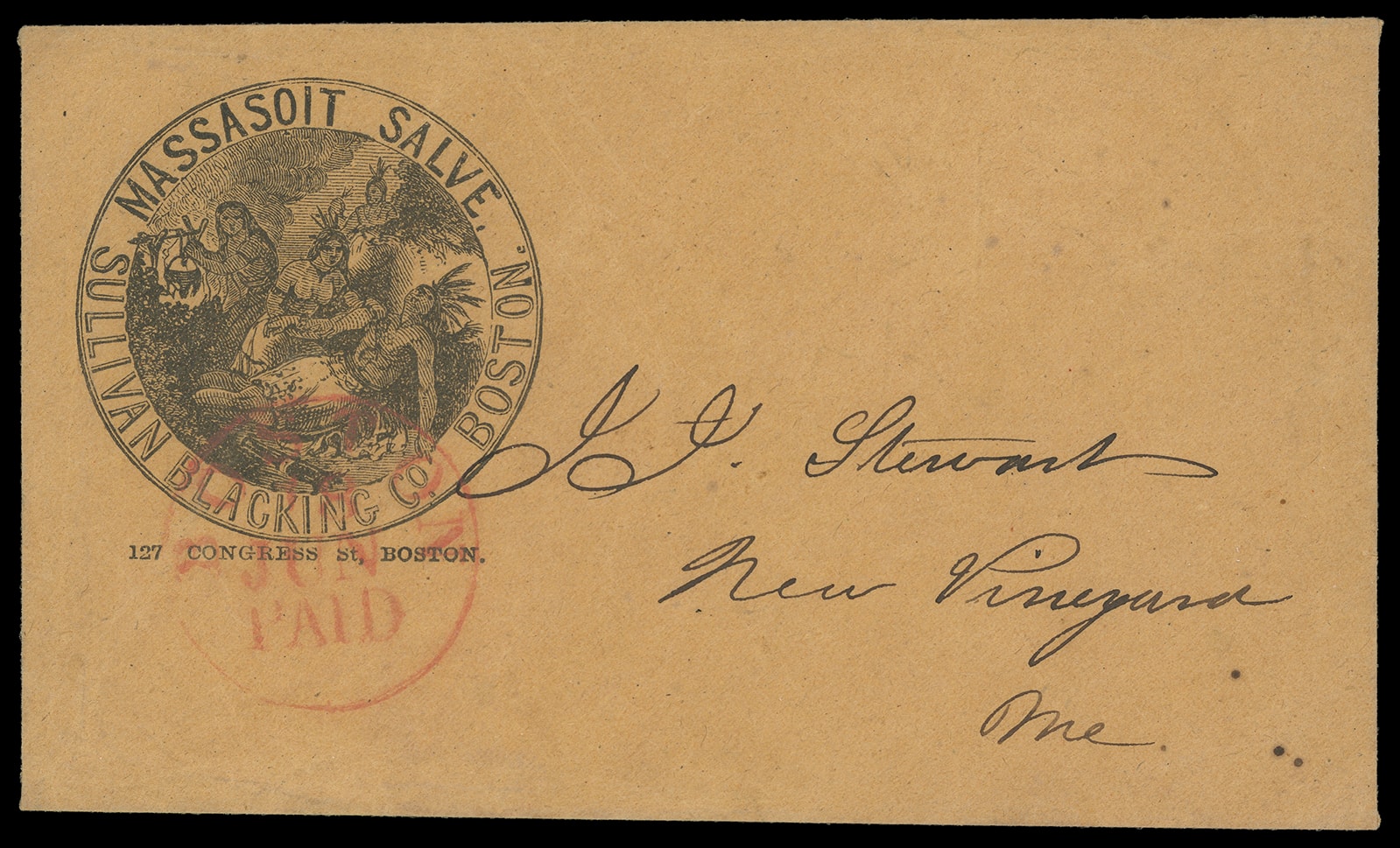 Salve, Sullivan Blacking Co., Boston, Mass. Illustrated large circular advertising showing Indian Maidens attending to fallen Warrier on unsealed orange stampless cover with red "Boston, Paid, 18 Jun" integral cds to New Vineyard, Me. at the