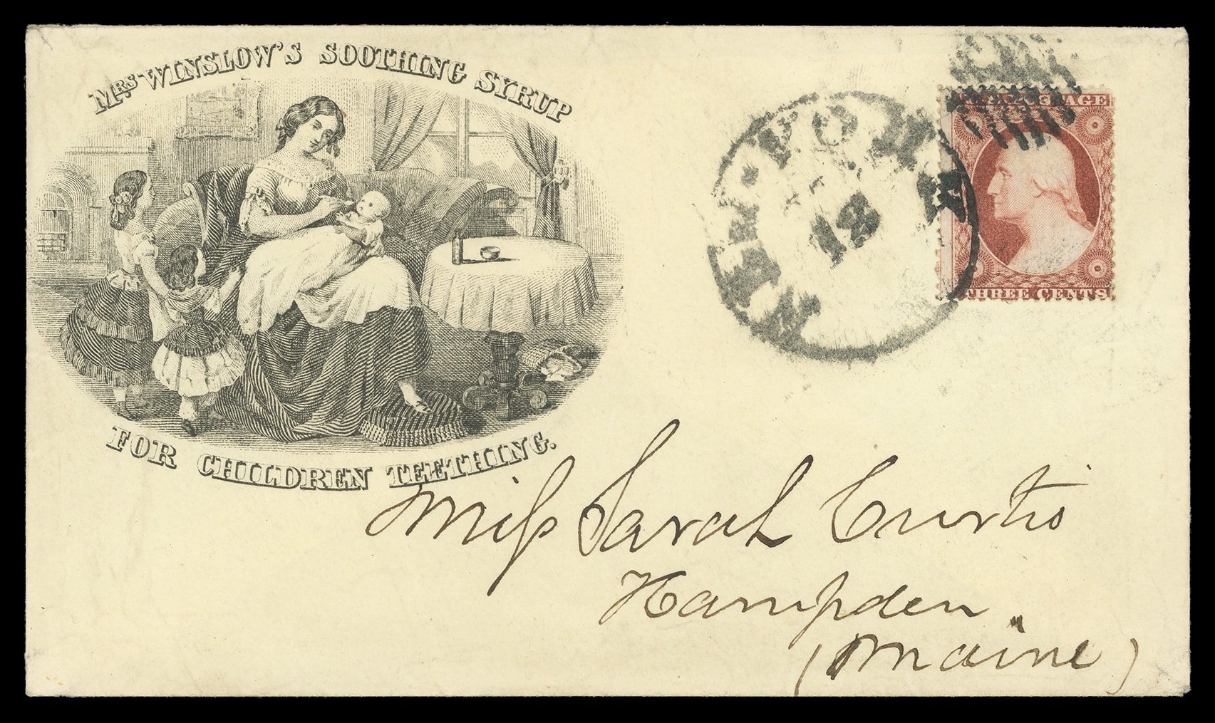 Winslow's Southing Salve For Children Teething". Large oval engraved illustration on amber cover bearing 3¢ dull red (26) tied by "New-York, Sep 12" cds duplexed with circular grid cancel to Hampden, Me., Very Fine and