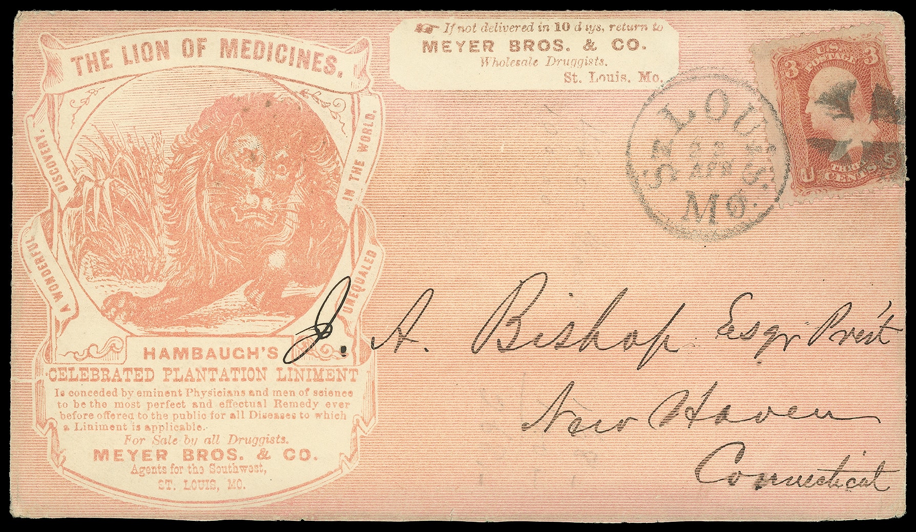 of Medicines, Meyer Bros. & Co., St. Louis Mo. Red overall illustrated advertising showing Lion and Wm. Murphy flap imprint on cover bearing 3¢ rose (65) tied by "St Louis Mo 22 Apr" duplex to New Haven Conn., Very Fine and