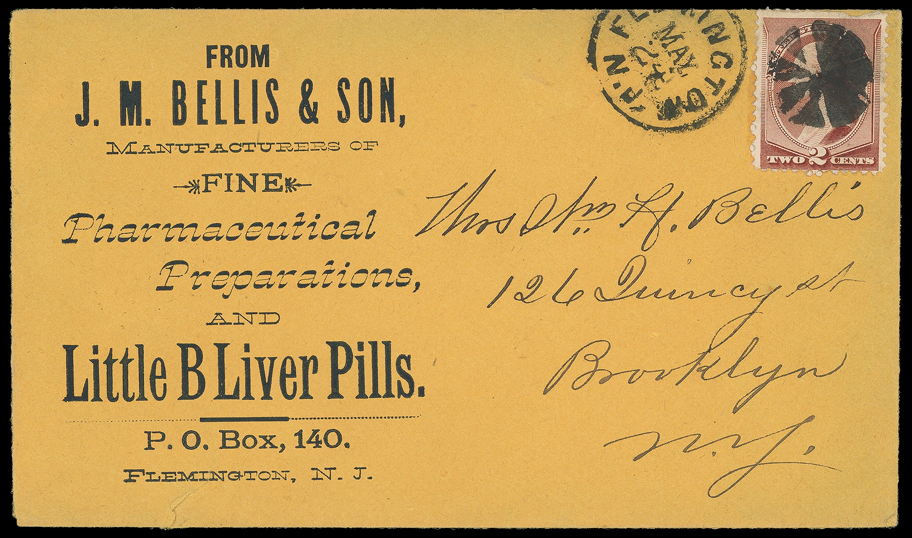 Liver Pills, J.M. Bellis & Son, Flemington, N.J. Advertising on orange cover bearing 2¢ brown (210) canceled by bold segmented cork cancel duplexed with "Flemington N.J. May 24" cds to Brooklyn N.Y., reverse with May 25th arrival