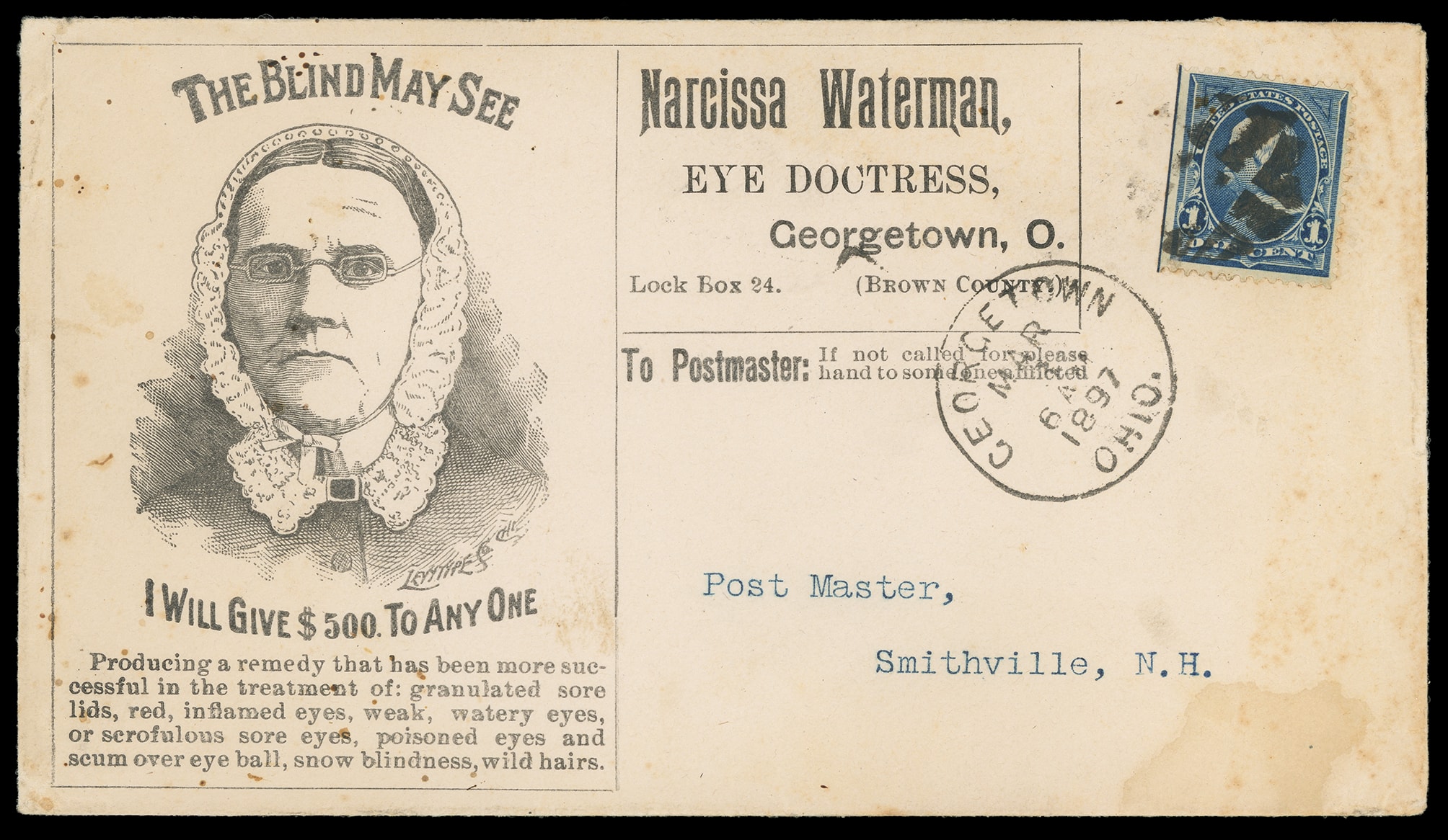 Waterman, Eye Doctress, Georgetown Ohio. Near overall illustrated "The Blind May See, I Will Give $500 to Anyone" advertising showing Elderly Woman with Eyeglasses on cover bearing 1¢ blue (264) tied by segmented cork duplexed with